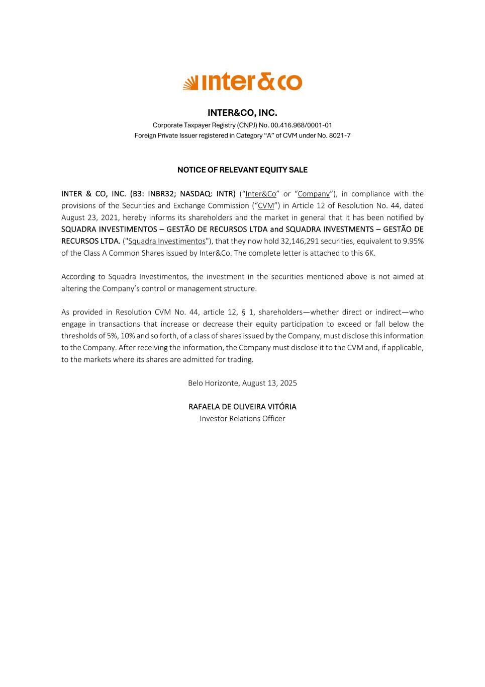 INTER&CO, INC. Corporate Taxpayer Registry (CNPJ) No. 00.416.968/0001-01 Foreign Private Issuer registered in Category “A” of CVM under No. 8021-7 NOTICE OF RELEVANT EQUITY SALE INTER & CO, INC. (B3: INBR32; NASDAQ: INTR) (“Inter&Co” or “Company”), in compliance with the provisions of the Securities and Exchange Commission (“CVM”) in Article 12 of Resolution No. 44, dated August 23, 2021, hereby informs its shareholders and the market in general that it has been notified by SQUADRA INVESTIMENTOS – GESTÃO DE RECURSOS LTDA and SQUADRA INVESTMENTS – GESTÃO DE RECURSOS LTDA. ("Squadra Investimentos"), that they now hold 32,146,291 securities, equivalent to 9.95% of the Class A Common Shares issued by Inter&Co. The complete letter is attached to this 6K. According to Squadra Investimentos, the investment in the securities mentioned above is not aimed at altering the Company’s control or management structure. As provided in Resolution CVM No. 44, article 12, § 1, shareholders—whether direct or indirect—who engage in transactions that increase or decrease their equity participation to exceed or fall below the thresholds of 5%, 10% and so forth, of a class of shares issued by the Company, must disclose this information to the Company. After receiving the information, the Company must disclose it to the CVM and, if applicable, to the markets where its shares are admitted for trading. Belo Horizonte, August 13, 2025 RAFAELA DE OLIVEIRA VITÓRIA Investor Relations Officer