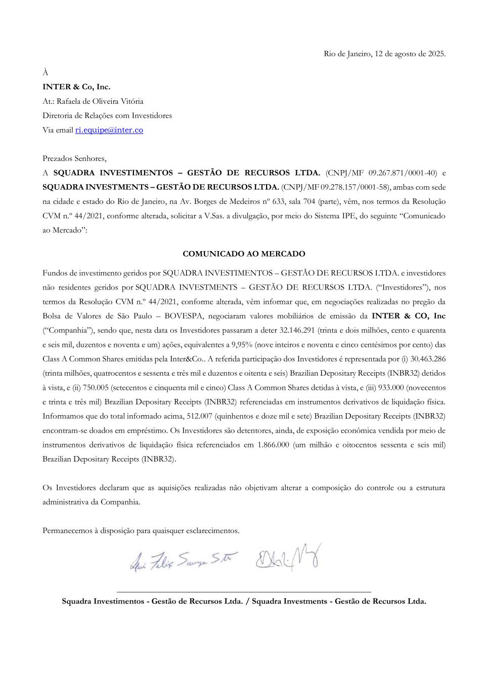 Rio de Janeiro, 12 de agosto de 2025. À INTER & Co, Inc. At.: Rafaela de Oliveira Vitória Diretoria de Relações com Investidores Via email ri.equipe@inter.co Prezados Senhores, A SQUADRA INVESTIMENTOS – GESTÃO DE RECURSOS LTDA. (CNPJ/MF 09.267.871/0001-40) e SQUADRA INVESTMENTS – GESTÃO DE RECURSOS LTDA. (CNPJ/MF 09.278.157/0001-58), ambas com sede na cidade e estado do Rio de Janeiro, na Av. Borges de Medeiros nº 633, sala 704 (parte), vêm, nos termos da Resolução CVM n.º 44/2021, conforme alterada, solicitar a V.Sas. a divulgação, por meio do Sistema IPE, do seguinte “Comunicado ao Mercado”: COMUNICADO AO MERCADO Fundos de investimento geridos por SQUADRA INVESTIMENTOS – GESTÃO DE RECURSOS LTDA. e investidores não residentes geridos por SQUADRA INVESTMENTS – GESTÃO DE RECURSOS LTDA. (“Investidores”), nos termos da Resolução CVM n.º 44/2021, conforme alterada, vêm informar que, em negociações realizadas no pregão da Bolsa de Valores de São Paulo – BOVESPA, negociaram valores mobiliários de emissão da INTER & CO, Inc (“Companhia”), sendo que, nesta data os Investidores passaram a deter 32.146.291 (trinta e dois milhões, cento e quarenta e seis mil, duzentos e noventa e um) ações, equivalentes a 9,95% (nove inteiros e noventa e cinco centésimos por cento) das Class A Common Shares emitidas pela Inter&Co.. A referida participação dos Investidores é representada por (i) 30.463.286 (trinta milhões, quatrocentos e sessenta e três mil e duzentos e oitenta e seis) Brazilian Depositary Receipts (INBR32) detidos à vista, e (ii) 750.005 (setecentos e cinquenta mil e cinco) Class A Common Shares detidas à vista, e (iii) 933.000 (novecentos e trinta e três mil) Brazilian Depositary Receipts (INBR32) referenciadas em instrumentos derivativos de liquidação física. Informamos que do total informado acima, 512.007 (quinhentos e doze mil e sete) Brazilian Depositary Receipts (INBR32) encontram-se doados em empréstimo. Os Investidores são detentores, ainda, de exposição econômica vendida por meio de instrumentos derivativos de liquidação física referenciados em 1.866.000 (um milhão e oitocentos sessenta e seis mil) Brazilian Depositary Receipts (INBR32). Os Investidores declaram que as aquisições realizadas não objetivam alterar a composição do controle ou a estrutura administrativa da Companhia. Permanecemos à disposição para quaisquer esclarecimentos. ____________________________________________________________ Squadra Investimentos - Gestão de Recursos Ltda. / Squadra Investments - Gestão de Recursos Ltda.