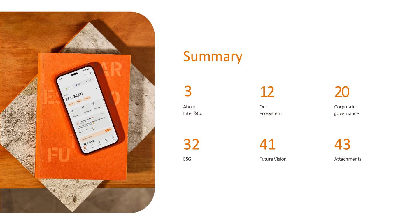 42 The remarkable achievements of 2024 serve to reinforce our unwavering commitment to innovation, sustainable growth strategies, and the consistent delivery of meaningful value to our customers, employees, and shareholders alike. We executed pivotal strategic initiatives that further solidify our Super App's position as a truly unique and comprehensive ecosystem within the financial services market, successfully reaching over 36 million individuals while persistently transforming lives through cutting-edge technological solutions. Yet at Inter, we perceive each achievement as merely the foundation for something far more ambitious, and what awaits us on the horizon is extraordinarily exciting. We are systematically constructing the infrastructure for an increasingly comprehensive, efficient, and globally-oriented platform. The strategic pillars of hyper- personalization, international expansion, and tangible impact on our customers' daily lives constitute the fundamental framework upon which Inter's future will be built. In 2025 and beyond, the answers will be found in the partnerships we'll forge, the products we'll introduce, and the distinctive experiences we'll craft for every customer. We possess the technology, we have the vision, and most importantly, we have the drive to remain at the forefront. I'm grateful to our team members who keep propelling Inter forward with unwavering dedication and creativity, to our shareholders who believe in and invest in our mission, and to our customers who remain at the heart of all we do. Looking ahead to next year, we're not simply focused on maintaining momentum – we're committed to evolution. Together, we will forge the future. What comes next? It's simple: more Inter João Vitor Menin CEO Global Inter Come with us! We constantly ask ourselves: what more can we do? Where can we innovate? How can we reach even further? Our Ecosystem Corporate GovernanceCorporate Governance ESGESG Vision for the futureVision for the future AttachmentsAttachments About InterCoAbout Inter&Co