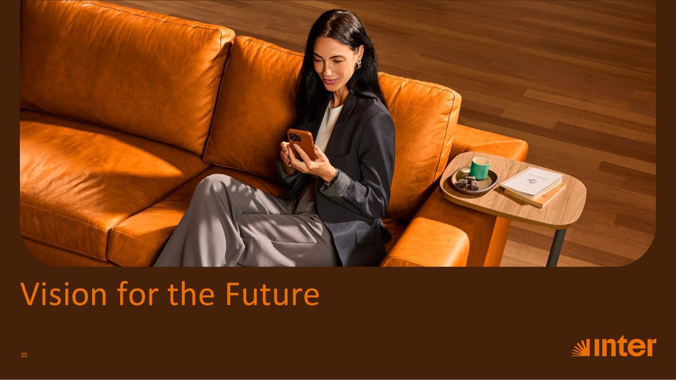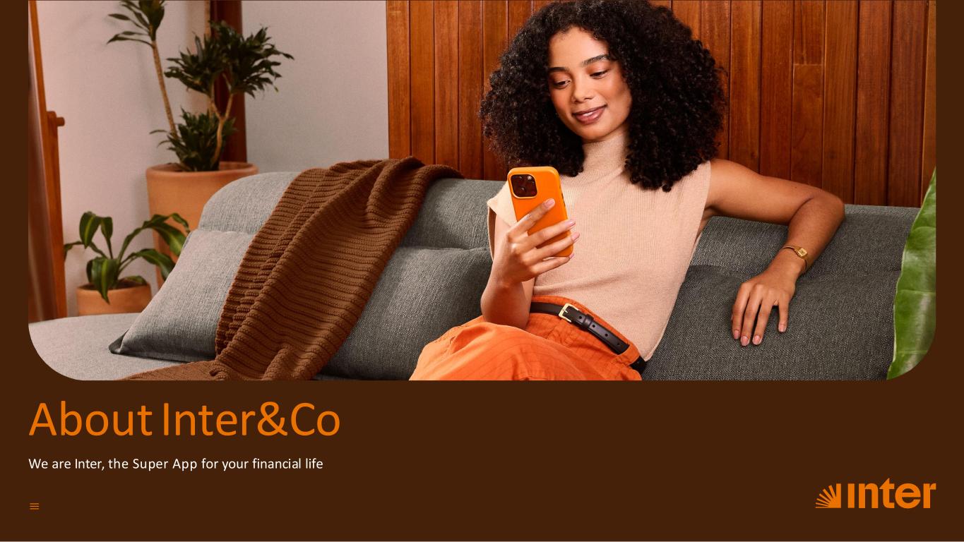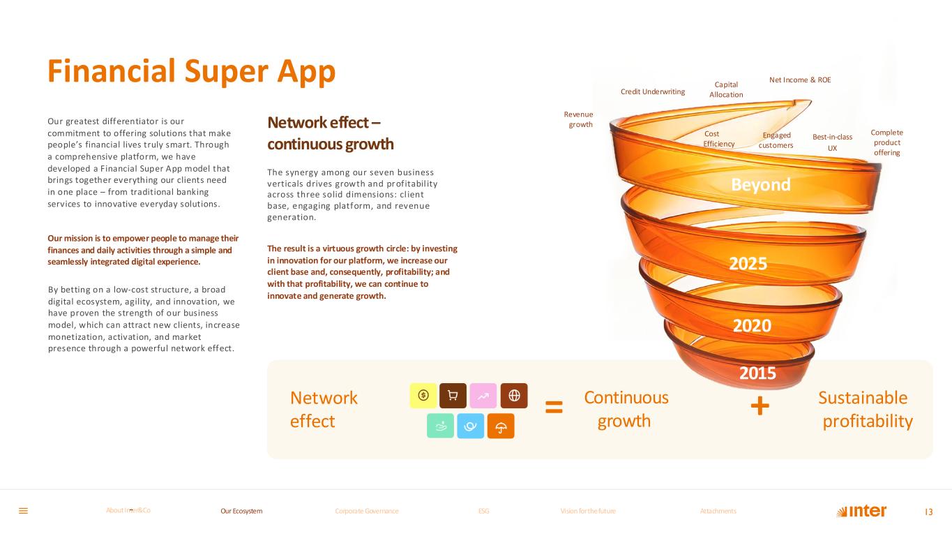 Financial Super App Our greatest differentiator is our commitment to offering solutions that make people’s financial lives truly smart. Through a comprehensive platform, we have developed a Financial Super App model that brings together everything our clients need in one place – from traditional banking services to innovative everyday solutions. Our mission is to empower people to manage their finances and daily activities through a simple and seamlessly integrated digital experience. By betting on a low-cost structure, a broad digital ecosystem, agility, and innovation, we have proven the strength of our business model, which can attract new clients, increase monetization, activation, and market presence through a powerful network effect. Network effect – continuous growth The synergy among our seven business verticals drives growth and pr of itabil ity across three solid dimensions: cl ient base, engaging platform, and revenue generation. The result is a virtuous growth circle: by investing in innovation for our platform, we increase our client base and, consequently, profitability; and with that profitability, we can continue to innovate and generate growth. Network effect Engaged customers 2020 13 2025 Beyond Complete product offering Best-in-class UX Net Income & ROE Capital AllocationCredit Underwriting Revenue growth Cost Efficiency Continuous growth= 2015 + Sustainable profitability Our Ecosystem Corporate GovernanceCorporate Governance ESGESG Vision for the futureVision for the future AttachmentsAttachments About InterCoAbout Inter&Co