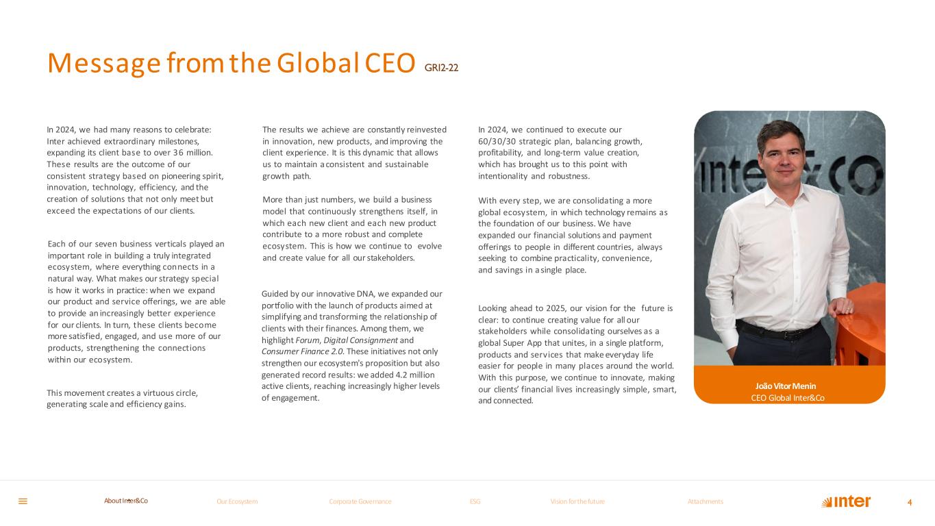 João Vitor Menin CEO Global Inter&Co Message from the Global C E O GRI2-22 In 2024, we had many reasons to celebrate: Inter achieved extraordinary milestones, expanding its client base to over 36 million. These results are the outcome of our consistent strategy based on pioneering spirit, innovation, technology, efficiency, and the creation of solutions that not only meet but exceed the expectations of our clients. Each of our seven business verticals played an important role in building a truly integrated ecosystem, where everything connects in a natural way. What makes our strategy special is how it works in practice: when we expand our product and service offerings, we are able to provide an increasingly better experience for our clients. In turn, these clients become more satisfied, engaged, and use more of our products, strengthening the connections within our ecosystem. This movement creates a virtuous circle, generating scale and efficiency gains. The results we achieve are constantly reinvested in innovation, new products, and improving the client experience. It is this dynamic that allows us to maintain a consistent and sustainable growth path. More than just numbers, we build a business model that continuously strengthens itself, in which each new client and each new product contribute to a more robust and complete ecosystem. This is how we continue to evolve and create value for all our stakeholders. Guided by our innovative DNA, we expanded our portfolio with the launch of products aimed at simplifying and transforming the relationship of clients with their finances. Among them, we highlight Forum, Digital Consignment and Consumer Finance 2.0. These initiatives not only strengthen our ecosystem's proposition but also generated record results: we added 4.2 million active clients, reaching increasingly higher levels of engagement. In 2024, we continued to execute our 60/30/30 strategic plan, balancing growth, profitability, and long-term value creation, which has brought us to this point with intentionality and robustness. With every step, we are consolidating a more global ecosystem, in which technology remains as the foundation of our business. We have expanded our financial solutions and payment offerings to people in different countries, always seeking to combine practicality, convenience, and savings in a single place. Looking ahead to 2025, our vision for the future is clear: to continue creating value for all our stakeholders while consolidating ourselves as a global Super App that unites, in a single platform, products and services that make everyday life easier for people in many places around the world. With this purpose, we continue to innovate, making our clients’ financial lives increasingly simple, smart, and connected. 4Our Ecosystem Corporate GovernanceCorporate Governance ESGESG Vision for the futureVision for the future AttachmentsAttachments About InterCoAbout Inter&Co