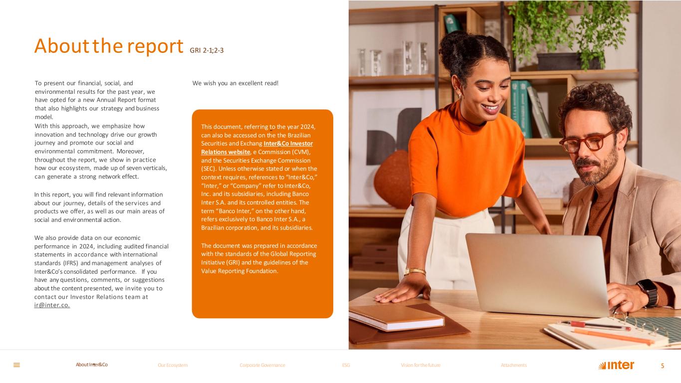 About the report GRI 2-1;2-3 This document, referring to the year 2024, can also be accessed on the the Brazilian Securities and Exchang InterCo Investor Relations website, e Commission (CVM), and the Securities Exchange Commission (SEC). Unless otherwise stated or when the context requires, references to “InterCo,” “Inter,” or “Company” refer to InterCo, Inc. and its subsidiaries, including Banco Inter S.A. and its controlled entities. The term “Banco Inter,” on the other hand, refers exclusively to Banco Inter S.A., a Brazilian corporation, and its subsidiaries. e was p epared in accordance with the standards of the Global Reporting Initiative (GRI) d the guidelines of the Value Reporting F undation. This d cum nt, referri g t th year 2024, can also be accessed on the the Brazilian S curiti s and Exchang Inter&Co Investor Relations website, e Commission (CVM), and the Secu i ies Exchange Commission (SEC). Unless otherwise stated or when the context requires, references to “Inter&Co,” “Inter,” or “Company” refer to Inter&Co, Inc. and its subsidiaries, including Banco Inter S.A. and its controlled entities. The term “Banco Inter,” on the other hand, refers exclusively to Banco Inter S.A., a Brazilian corporation, and its subsidiaries. The document was prepared in accordance with the standards of the Global Reporting Initiative (GRI) and the guidelines of the Value Reporting Foundation. To present our financial, social, and environmental results for the past year, we have opted for a new Annual Report format that also highlights our strategy and business model. 5 With this approach, we emphasize how innovation and technology drive our growth journey and promote our social and environmental commitment. Moreover, throughout the report, we show in practice how our ecosystem, made up of seven verticals, can generate a strong network effect. In this report, you will find relevant information about our journey, details of the services and products we offer, as well as our main areas of social and environmental action. We also provide data on our economic performance in 2024, including audited financial statements in accordance with international standards (IFRS) and management analyses of Inter&Co’s consolidated performance. If you have any questions, comments, or suggestions about the content presented, we invite you to contact our Investor Relations team at ir@inter.co. We wish you an excellent read! Our Ecosystem Corporate GovernanceCorporate Governance ESGESG Vision for the futureVision for the future AttachmentsAttachments About InterCoAbout Inter&Co