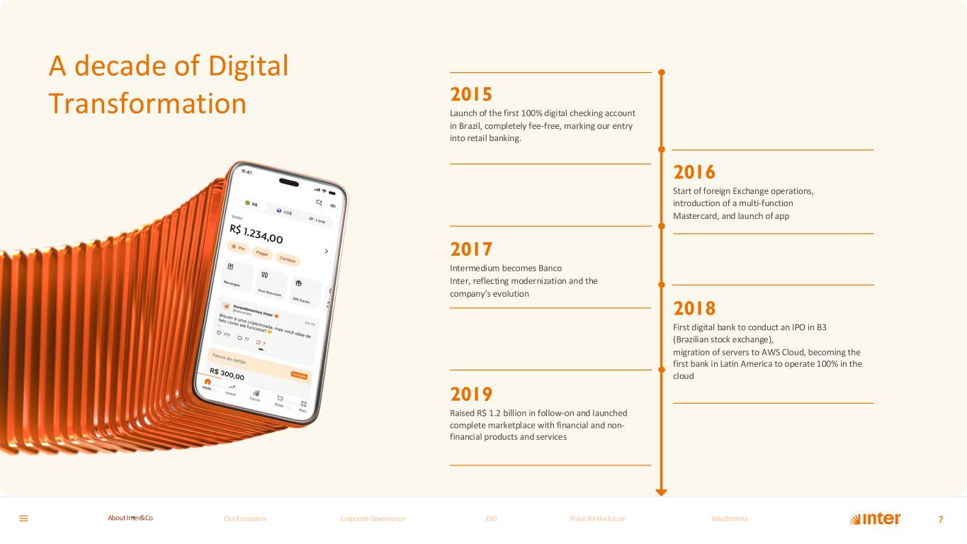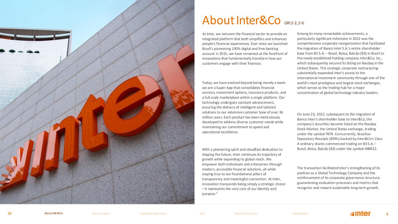 At Inter, we reinvent the financial sector to provide an integrated platform that both simplifies and enhances people's financial experiences. Ever since we launched Brazil's pioneering 100% digital and free banking account in 2015, we have remained at the forefront of innovations that fundamentally transform how our customers engage with their finances. Today, we have evolved beyond being merely a bank: we are a Super App that consolidates financial services, investment options, insurance products, and a full-scale marketplace within a single platform. Our technology undergoes constant advancement, ensuring the delivery of intelligent and tailored solutions to our extensive customer base of over 36 million users. Each product has been meticulously developed to address diverse customer needs while maintaining our commitment to speed and operational excellence. With a pioneering spirit and steadfast dedication to shaping the future, Inter continues its trajectory of growth while expanding its global reach. We empower both individuals and enterprises through modern, accessible financial solutions, all while staying true to our foundational pillars of transparency and meaningful connection. At Inter, innovation transcends being simply a strategic choice – it represents the very core of our identity and purpose." Among its many remarkable achievements, a particularly significant milestone in 2022 was the comprehensive corporate reorganization that facilitated the migration of Banco Inter S.A.'s entire shareholder base from B3 S.A. – Brasil, Bolsa, Balcão (B3) in Brazil to the newly established holding company Inter&Co, Inc., which subsequently secured its listing on Nasdaq in the United States. This strategic corporate restructuring substantially expanded Inter's access to the international investment community through one of the world's most prestigious and largest stock exchanges, which serves as the trading hub for a major concentration of global technology industry leaders. On June 23, 2022, subsequent to the migration of Banco Inter's shareholder base to Inter&Co, the company's securities became listed on the Nasdaq Stock Market, the United States exchange, trading under the symbol INTR. Concurrently, Brazilian Depositary Receipts (BDRs) backed by Inter&Co's Class A ordinary shares commenced trading on B3 S.A. – Brasil, Bolsa, Balcão (B3) under the symbol INBR32. The transaction facilitated Inter's strengthening of its position as a Global Technology Company and the reinforcement of its corporate governance structure, guaranteeing evaluation processes and metrics that recognize and reward sustainable long-term growth. 6 About Inter&Co GRI2-2; 2-6 Our Ecosystem Corporate GovernanceCorporate Governance ESGESG Vision for the futureVision for the future AttachmentsAttachments About InterCoAbout Inter&Co