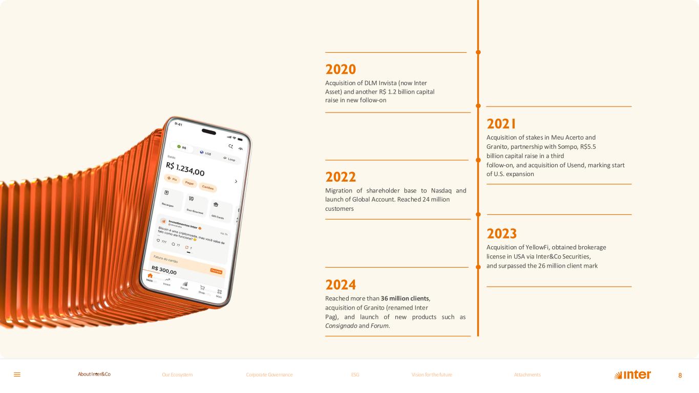 A decade of Digital Transformation 2015 Launch of the first 100% digital checking account in Brazil, completely fee-free, marking our entry into retail banking. 7 2016 Start of foreign Exchange operations, introduction of a multi-function Mastercard, and launch of app 2017 Intermedium becomes Banco Inter, reflecting modernization and the company’s evolution 2018 First digital bank to conduct an IPO in B3 (Brazilian stock exchange), migration of servers to AWS Cloud, becoming the first bank in Latin America to operate 100% in the cloud 2019 Raised R$ 1.2 billion in follow-on and launched complete marketplace with financial and non- financial products and services Our Ecosystem Corporate GovernanceCorporate Governance ESGESG Vision for the futureVision for the future AttachmentsAttachments About InterCoAbout Inter&Co