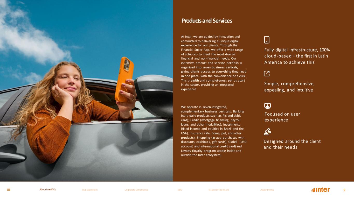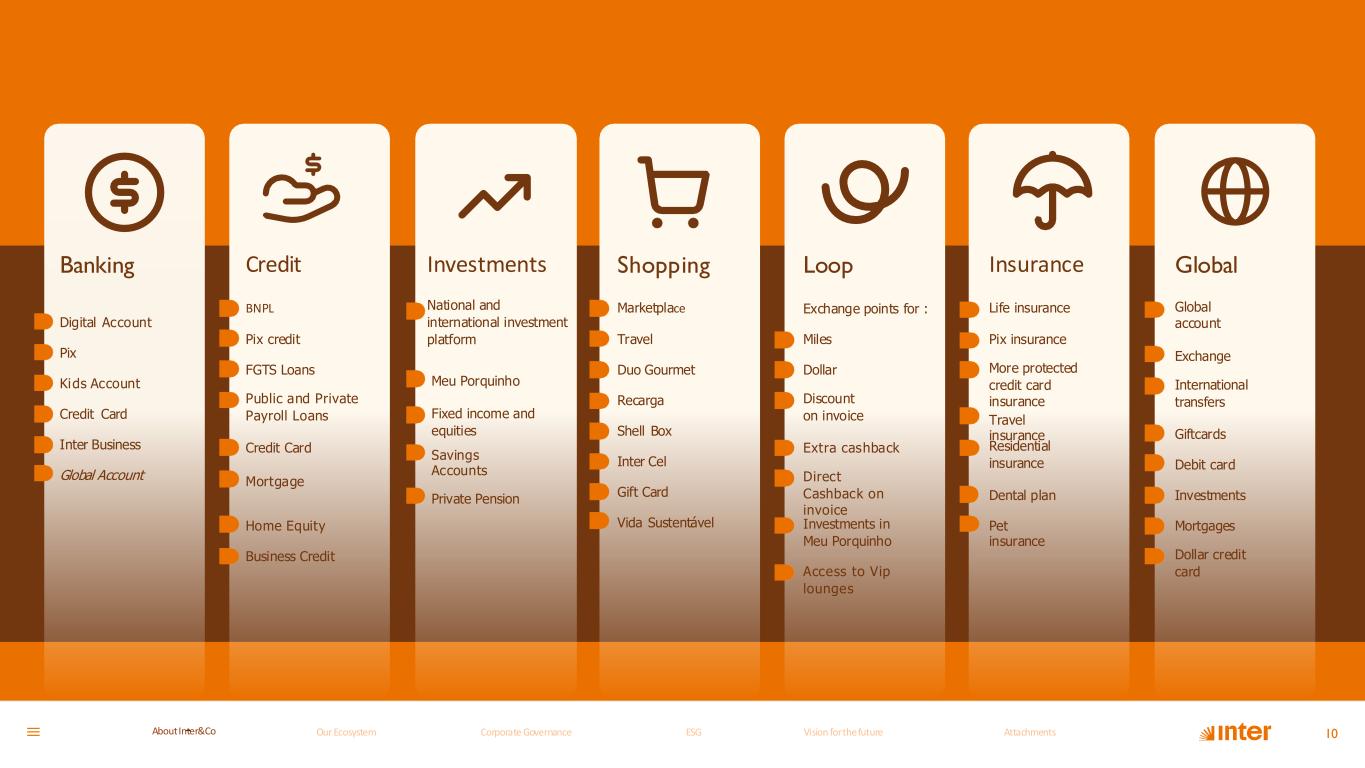 Productsand Services 9 We operate in seven integrated, complementary business verticals: Banking (core daily products such as Pix and debit card); Credit (mortgage financing, payroll loans, and other modalities); Investments (fixed income and equities in Brazil and the USA); Insurance (life, home, pet, and other products); Shopping (in-app purchases with discounts, cashback, gift cards); Global (USD account and international credit card) and Loyalty (loyalty program usable inside and outside the Inter ecosystem). At Inter, we are guided by innovation and committed to delivering a unique digital experience for our clients. Through the Financial Super App, we offer a wide range of solutions to meet the most diverse financial and non-financial needs. Our extensive product and service portfolio is organized into seven business verticals, giving clients access to everything they need in one place, with the convenience of a click. This breadth and completeness set us apart in the sector, providing an integrated experience. Simple, comprehensive, appealing, and intuitive Focused on user experience Designed around the client and their needs Fully digital infrastructure, 100% cloud-based – the first in Latin America to achieve this Our Ecosystem Corporate GovernanceCorporate Governance ESGESG Vision for the futureVision for the future AttachmentsAttachments About InterCoAbout Inter&Co