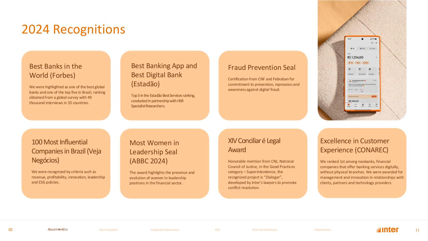 2024 Recognitions Excellence in Customer Experience (CONAREC) We ranked 1st among neobanks, financial companies that offer banking services digitally, without physical branches. We were awarded for management and innovation in relationships with clients, partners and technology providers. 11 Best Banks in the World (Forbes) We were highlighted as one of the best global banks and one of the top five in Brazil, ranking obtained from a global survey with 49 thousand interviews in 33 countries. Best Banking App and Best Digital Bank (Estadão) Top 3 in the Estadão Best Services ranking, conducted in partnership with HSR Specialist Researchers. Fraud Prevention Seal Certification from CNF and Febraban for commitment to prevention, repression and awareness against digital fraud. 100 Most Influential Companies in Brazil (Veja Negócios) We were recognized by criteria such as revenue, profitability, innovation, leadership and ESG policies. Most Women in Leadership Seal (ABBC 2024) The award highlights the presence and evolution of women in leadership positions in the financial sector. XIV Conciliar é Legal Award Honorable mention from CNJ, National Council of Justice, in the Good Practices category – Superintendence, the recognized project is “Dialogar”, developed by Inter's lawyers to promote conflict resolution. Our Ecosystem Corporate GovernanceCorporate Governance ESGESG Vision for the futureVision for the future AttachmentsAttachments About InterCoAbout Inter&Co