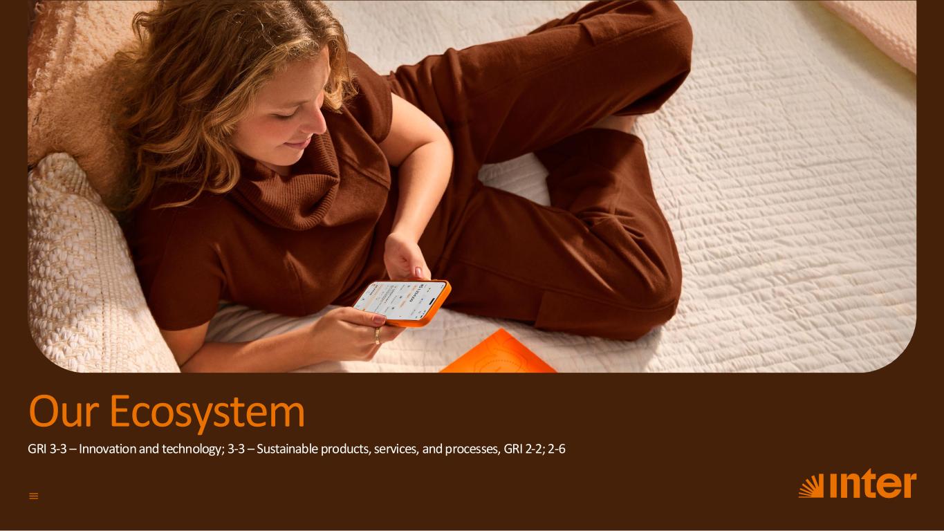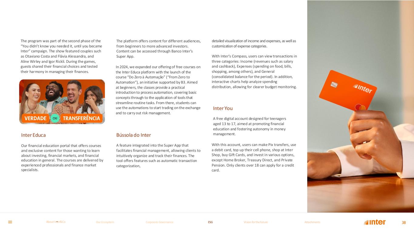 The program was part of the second phase of the “You didn’t know you needed it, until you became Inter” campaign. The show featured couples such as Otaviano Costa and Flávia Alessandra, and Aline Wirley and Igor Rickli. During the games, guests shared their financial choices and tested their harmony in managing their finances. Inter Educa Our financial education portal that offers courses and exclusive content for those wanting to learn about investing, financial markets, and financial education in general. The courses are delivered by experienced professionals and finance market specialists. The platform offers content for different audiences, from beginners to more advanced investors. Content can be accessed through Banco Inter’s Super App. In 2024, we expanded our offering of free courses on the Inter Educa platform with the launch of the course “Do Zero à Automação” (“From Zero to Automation”), an initiative supported by B3. Aimed at beginners, the classes provide a practical introduction to process automation, covering basic concepts through to the application of tools that streamline routine tasks. From there, students can use the automations to start trading on the exchange and to carry out risk management. Bússola do Inter A feature integrated into the Super App that facilitates financial management, allowing clients to intuitively organize and track their finances. The tool offers features such as automatic transaction categorization, detailed visualization of income and expenses, as well as customization of expense categories. With Inter’s Compass, users can view transactions in three categories: Income (revenues such as salary and cashback), Expenses (spending on food, bills, shopping, among others), and General (consolidated balance for the period). In addition, interactive charts help analyze spending distribution, allowing for clearer budget monitoring. Inter You A free digital account designed for teenagers aged 13 to 17, aimed at promoting financial education and fostering autonomy in money management. With this account, users can make Pix transfers, use a debit card, top up their cell phone, shop at Inter Shop, buy Gift Cards, and invest in various options, except Home Broker, Treasury Direct, and Private Pension. Only clients over 18 can apply for a credit card. 38Our Ecosystem Corporate GovernanceCorporate Governance ESGESG Vision for the futureVision for the future AttachmentsAttachments About InterCoAbout Inter&Co
