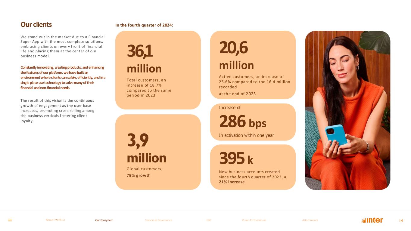 Our clients We stand out in the market due to a Financial Super App with the most complete solutions, embracing clients on every front of financial life and placing them at the center of our business model. 14 Constantly innovating, creating products, and enhancing the features of our platform, we have built an environment where clients can safely, efficiently, and in a single place use technology to solve many of their financial and non-financial needs. The result of this vision is the continuous growth of engagement as the user base increases, promoting cross-selling among the business verticals fostering client loyalty. 20,6 million Active customers, an increase of 25.6% compared to the 16.4 mil lion recorded at the end of 2 023 Increase of 286 bps In activation within one year 395 k New business accounts created since the fourth quarter of 2023, a 21% increase In the fourth quarter of 2024: 36,1 million Total customers , an increase of 18.7% compared to the same period in 2023 3,9 million Global customers , 79% growth Our Ecosystem Corporate GovernanceCorporate Governance ESGESG Vision for the futureVision for the future AttachmentsAttachments About InterCoAbout Inter&Co