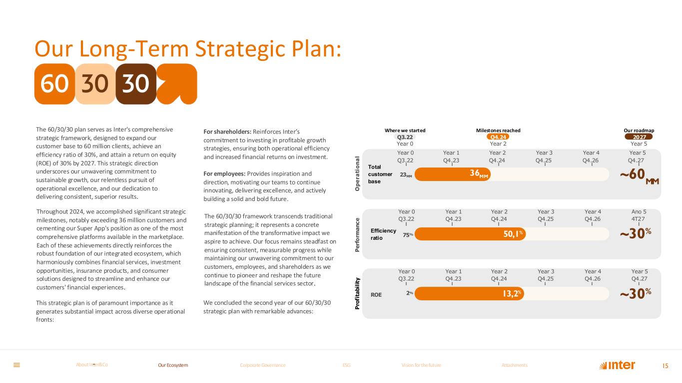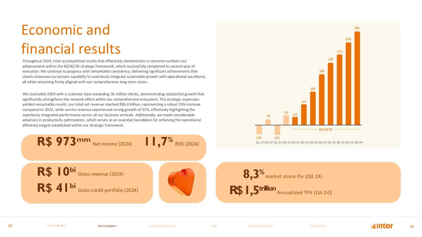 The 60/30/30 plan serves as Inter's comprehensive strategic framework, designed to expand our customer base to 60 million clients, achieve an efficiency ratio of 30%, and attain a return on equity (ROE) of 30% by 2027. This strategic direction underscores our unwavering commitment to sustainable growth, our relentless pursuit of operational excellence, and our dedication to delivering consistent, superior results. Throughout 2024, we accomplished significant strategic milestones, notably exceeding 36 million customers and cementing our Super App's position as one of the most comprehensive platforms available in the marketplace. Each of these achievements directly reinforces the robust foundation of our integrated ecosystem, which harmoniously combines financial services, investment opportunities, insurance products, and consumer solutions designed to streamline and enhance our customers' financial experiences. This strategic plan is of paramount importance as it generates substantial impact across diverse operational fronts: For shareholders: Reinforces Inter’s commitment to investing in profitable growth strategies, ensuring both operational efficiency and increased financial returns on investment. For employees: Provides inspiration and direction, motivating our teams to continue innovating, delivering excellence, and actively building a solid and bold future. The 60/30/30 framework transcends traditional strategic planning; it represents a concrete manifestation of the transformative impact we aspire to achieve. Our focus remains steadfast on ensuring consistent, measurable progress while maintaining our unwavering commitment to our customers, employees, and shareholders as we continue to pioneer and reshape the future landscape of the financial services sector. We concluded the second year of our 60/30/30 strategic plan with remarkable advances: Our Long-Term Strategic Plan: 75% Efficiency ratio P e rf o rm a n c e 50,1% Ano 5 4T27 ~30% Year 4 Q4.26 Year 3 Q4.25 Year 2 Q4.24 Year 1 Q4.23 Year 0 Q3.22 2% ROE P ro fi ta b il it y 13,2% Year 5 Q4.27 ~30% Year 4 Q4.26 Year 3 Q4.25 Year 2 Q4.24 Year 1 Q4.23 Year 0 Q3.22 Total customer base 23MM O p e r a ti o n a l 36MM ~60 MM Year 0 Year 1 Year 2 Year 3 Year 4 Year 5 Q3.22 Q4.23 Q4.24 Q4.25 Q4.26 Q4.27 Where we started Milestones reached Our roadmap Q3.22 Q4.24 2027 Year 0 Year 2 Year 5 15Our Ecosystem Corporate GovernanceCorporate Governance ESGESG Vision for the futureVision for the future AttachmentsAttachments About InterCoAbout Inter&Co