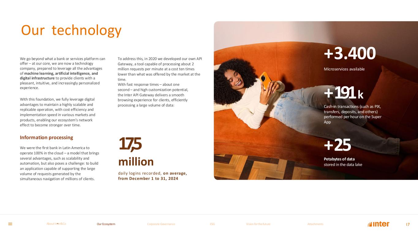 Our technology 17 With this foundation, we fully leverage digital advantages to maintain a highly scalable and replicable operation, with cost efficiency and implementation speed in various markets and products, enabling our ecosystem’s network effect to become stronger over time. Information processing We were the first bank in Latin America to operate 100% in the cloud – a model that brings several advantages, such as scalability and automation, but also poses a challenge: to build an application capable of supporting the large volume of requests generated by the simultaneous navigation of millions of clients. To address this, in 2020 we developed our own API Gateway, a tool capable of processing about 2 million requests per minute at a cost ten times lower than what was offered by the market at the time. With fast response times – about one second – and high customization potential, the Inter API Gateway delivers a smooth browsing experience for clients, efficiently processing a large volume of data: +3.400 Microservices available +191k Cash-in transactions (such as PIX, transfers, deposits, and others) performed per hour on the Super App +25 Petabytes of data stored in the data lake 17,5 million daily logins recorded, on average, from December 1 to 31, 2024 We go beyond what a bank or services platform can offer – at our core, we are now a technology company, prepared to leverage all the advantages of machine learning, artificial intelligence, and digital infrastructure to provide clients with a pleasant, intuitive, and increasingly personalized experience. Our Ecosystem Corporate GovernanceCorporate Governance ESGESG Vision for the futureVision for the future AttachmentsAttachments About InterCoAbout Inter&Co