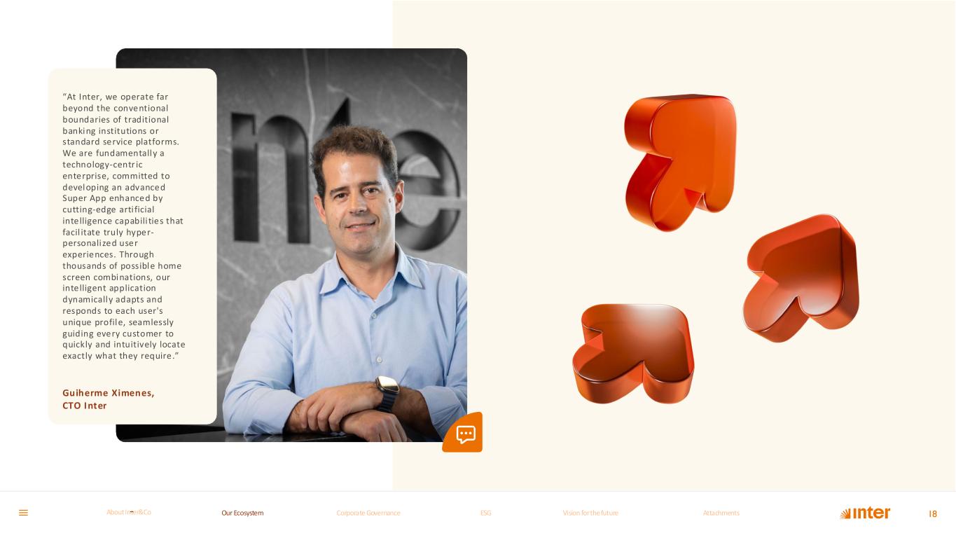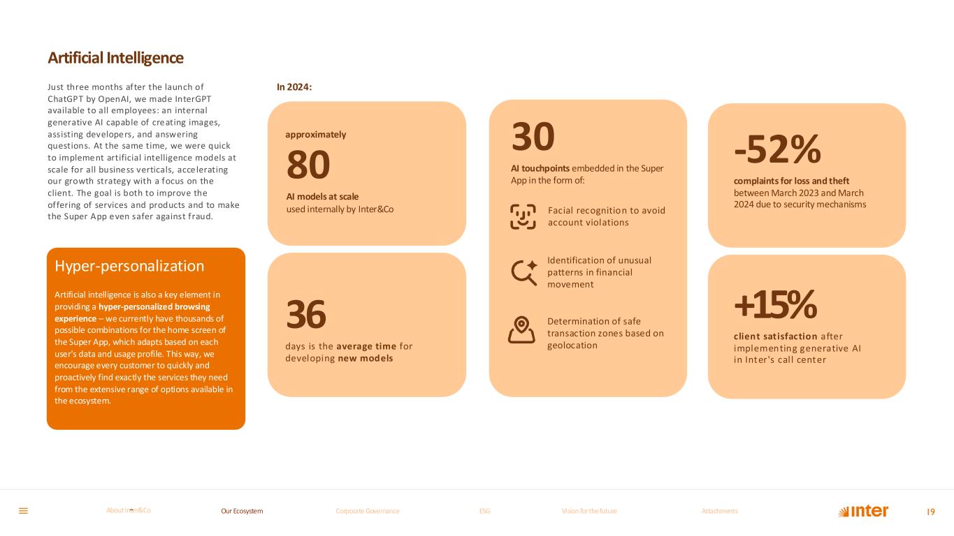 “At Inter, we operate far beyond the conventional boundaries of traditional banking institutions or standard service platforms. We are fundamentally a technology-centr ic enterprise, committed to developing an advanced Super App enhanced by cutting-edge arti ficial intelligence capabili ties that facil itate truly hyper- personalized user experiences. Through thousands of possible home screen combinations, our intelligent application dynamically adapts and responds to each user's unique profile, seamlessly guiding every customer to quickly and intuitively locate exactly what they require.” Guiherme Ximenes, CTO Inter 18Our Ecosystem Corporate GovernanceCorporate Governance ESGESG Vision for the futureVision for the future AttachmentsAttachments About InterCoAbout Inter&Co