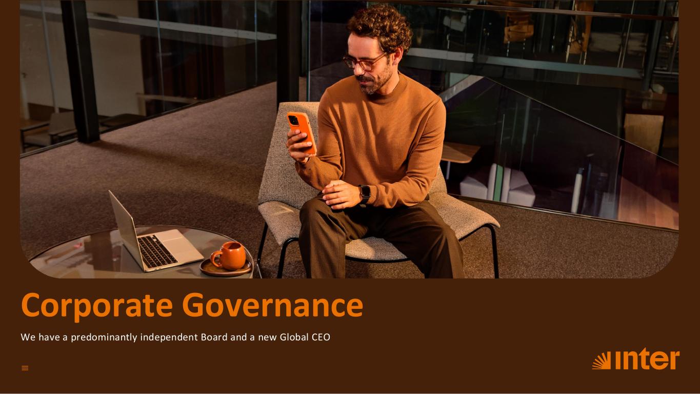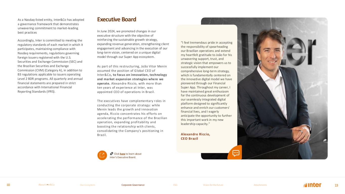 As a Nasdaq-listed entity, Inter&Co has adopted a governance framework that demonstrates unwavering commitment to market-leading best practices 23 Accordingly, Inter is committed to meeting the regulatory standards of each market in which it participates, maintaining compliance with Nasdaq requirements, regulations governing foreign issuers registered with the U.S. Securities and Exchange Commission (SEC) and the Brazilian Securities and Exchange Commission (CVM) (Category A), in addition to B3 regulations applicable to issuers operating Level 2 BDR programs. All quarterly and annual financial statements are prepared in strict accordance with International Financial Reporting Standards (IFRS). “I feel tremendous pride in accepting the responsibility of spearheading our Brazilian operations and extend my heartfelt gratitude to João for his unwavering support, trust, and strategic vision that empowers us to successfully implement our comprehensive long-term strategy, which is fundamentally centered on the innovative digital model we have pioneered through our Financial Super App. Throughout my career, I have maintained great enthusiasm for the continuous development of our seamlessly integrated digital platform designed to significantly enhance and enrich our customers' financial lives, and I eagerly anticipate the opportunity to further this important work in my new leadership capacity.” Alexandre Riccio, CEO Braz il In June 2024, we promoted changes in our executive structure with the objective of reinforcing the sustainable growth strategy, expanding revenue generation, strengthening client engagement and advancing in the execution of our long-term vision, centered on a unique digital model through our Super App ecosystem. As part of this restructuring, João Vitor Menin assumed the position of Global CEO of Inter&Co, to focus on innovation, technology and market expansion strategies where we operate. Alexandre Riccio, with more than ten years of experience at Inter, was appointed CEO of operations in Brazil. The executives have complementary r oles in conducting the corporate strategy: while Menin leads the growth and innovation agenda, Riccio concentrates his efforts on accelerating the performance of the Brazilian operation, expanding prof itabil ity and boosting the relationship with cl ients, consolidating the Company's positioning in Brazi l. Executive Board Click here to learn about Inter's Executive Board. Our Ecosystem Corporate GovernanceCorporate Governance ESGESG Vision for the futureVision for the future AttachmentsAttachments About InterCoAbout Inter&Co