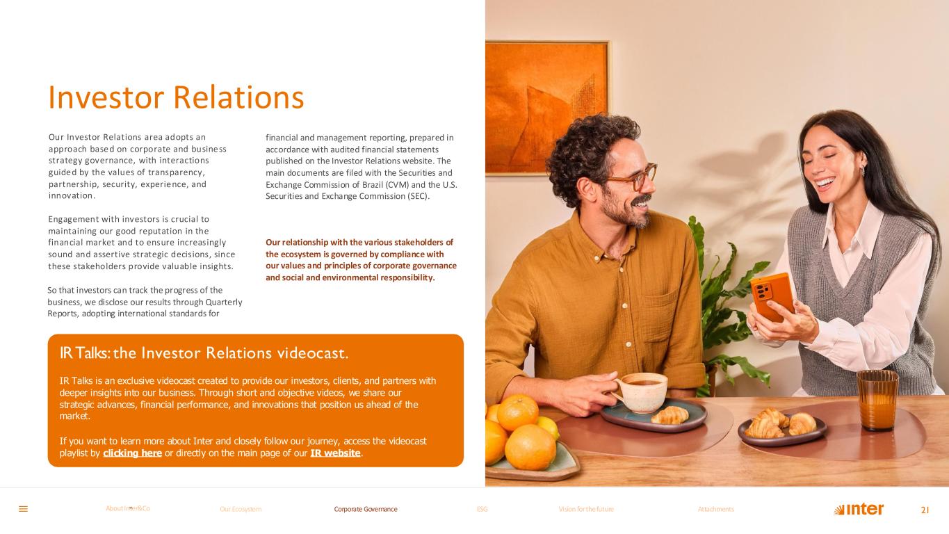 Our Investor Relations area adopts an approach based on corporate and business strategy governance, with interactions guided by the values of transparency, partnership, security, experience, and innovation. Engagement with investors is crucial to maintaining our good reputation in the financial market and to ensure increasingly sound and assertive strategic decisions, since these stakeholders provide valuable insights. So that investors can track the progress of the business, we disclose our results through Quarterly Reports, adopting international standards for financial and management reporting, prepared in accordance with audited financial statements published on the Investor Relations website. The main documents are filed with the Securities and Exchange Commission of Brazil (CVM) and the U.S. Securities and Exchange Commission (SEC). Our relationship with the various stakeholders of the ecosystem is governed by compliance with our values and principles of corporate governance and social and environmental responsibility. Investor Relations 21 IRTalks: the Investor Relations videocast. IR Talks is an exclusive videocast created to provide our investors, clients, and partners with deeper insights into our business. Through short and objective videos, we share our strategic advances, financial performance, and innovations that position us ahead of the market. If you want to learn more about Inter and closely follow our journey, access the videocast playlist by clicking here or directly on the main page of our IR website. Our Ecosystem Corporate GovernanceCorporate Governance ESGESG Vision for the futureVision for the future AttachmentsAttachments About InterCoAbout Inter&Co