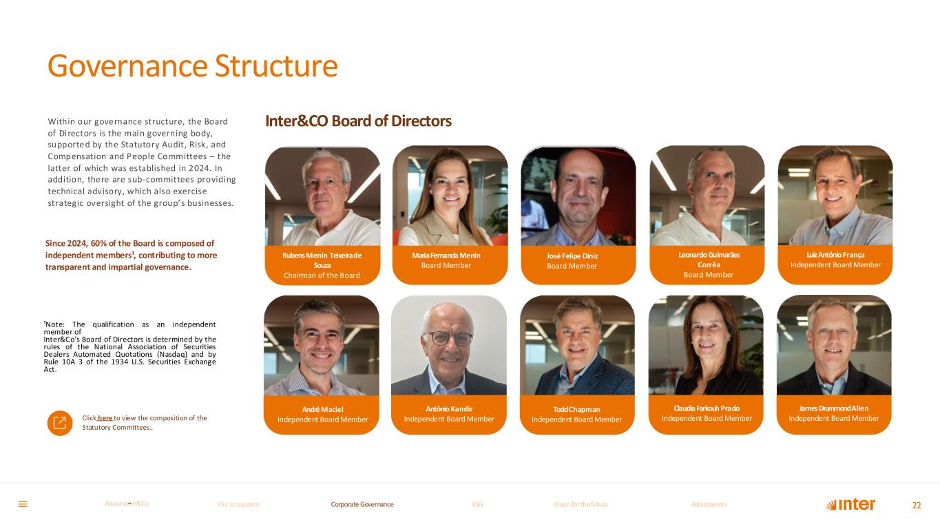 Within our governance structure, the Board of Directors is the main governing body, supported by the Statutory Audit, Risk, and Compensation and People Committees – the latter of which was established in 2024. In addition, there are sub-committees providing technical advisory, which also exercise strategic oversight of the group’s businesses. Since 2024, 60% of the Board is composed of independent members¹, contributing to more transparent and impartial governance. Governance Structure Click here to view the composition of the Statutory Committees.. Inter&CO Board of Directors Rubens Menin Teixeirade Souza Chairman of the Board 22 MariaFernanda Menin Board Member André Maciel Independent Board Member Antônio Kandir Independent Board Member José Felipe Diniz Board Member ToddChapman Independent Board Member Leonardo Guimarães Corrêa Board Member Claudia Farkouh Prado Independent Board Member LuizAntônio França Independent Board Member James DrummondAllen Independent Board Member ¹Note: The qualification as an independent member of Inter&Co’s Board of Directors is determined by the rules of the National Association of Securities Dealers Automated Quotations (Nasdaq) and by Rule 10A 3 of the 1934 U.S. Securities Exchange Act. Our Ecosystem Corporate GovernanceCorporate Governance ESGESG Vision for the futureVision for the future AttachmentsAttachments About InterCoAbout Inter&Co