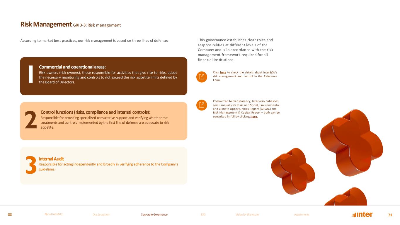 1 2 3 24 Risk Management GRI 3-3: Risk management According to market best practices, our risk management is based on three lines of defense: Commercial and operational areas: Risk owners (risk owners), those responsible for activities that give rise to risks, adopt the necessary monitoring and controls to not exceed the risk appetite limits defined by the Board of Directors. Control functions (risks, compliance and internal controls): Responsible for providing specialized consultative support and verifying whether the treatments and controls implemented by the first line of defense are adequate to risk appetite. Internal Audit Responsible for acting independently and broadly in verifying adherence to the Company's guidelines. This governance establishes clear roles and responsibilities at different levels of the Company and is in accordance with the risk management framework required for all financial institutions. Click here to check the details about Inter&Co's risk management and control in the Reference Form. Committed to transparency, Inter also publishes semi-annually its Risks and Social, Environmental and Climate Opportunities Report (GRSAC) and Risk Management & Capital Report – both can be consulted in full by clicking here. Our Ecosystem Corporate GovernanceCorporate Governance ESGESG Vision for the futureVision for the future AttachmentsAttachments About InterCoAbout Inter&Co