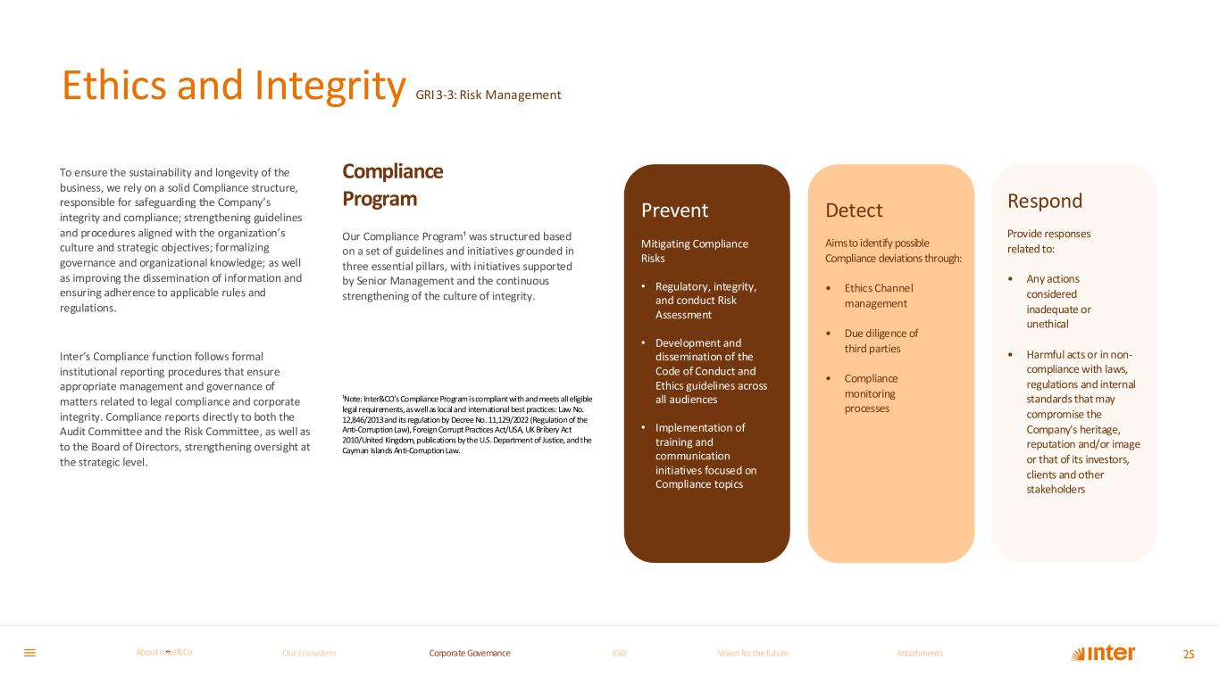 Ethics and Integrity GRI3-3: Risk Management To ensure the sustainability and longevity of the business, we rely on a solid Compliance structure, responsible for safeguarding the Company’s integrity and compliance; strengthening guidelines and procedures aligned with the organization’s culture and strategic objectives; formalizing governance and organizational knowledge; as well as improving the dissemination of information and ensuring adherence to applicable rules and regulations. Inter’s Compliance function follows formal institutional reporting procedures that ensure appropriate management and governance of matters related to legal compliance and corporate integrity. Compliance reports directly to both the Audit Committee and the Risk Committee, as well as to the Board of Directors, strengthening oversight at the strategic level. Compliance Program Our Compliance Program¹ was structured based on a set of guidelines and initiatives grounded in three essential pillars, with initiatives supported by Senior Management and the continuous strengthening of the culture of integrity. ¹Note: Inter&CO’s Compliance Program is compliant with and meets all eligible legal requirements, as well as local and international best practices: Law No. 12,846/2013 and its regulation by Decree No. 11,129/2022 (Regulation of the Anti-Corruption Law), Foreign Corrupt Practices Act/USA, UK Bribery Act 2010/United Kingdom, publications by the U.S. Department of Justice, and the Cayman Islands Anti-Corruption Law. Detect Aims to identify possible Compliance deviations through: • Ethics Channel management • Due diligence of third parties • Compliance monitoring processes 25 Prevent Mitigating Compliance Risks • Regulatory, integrity, and conduct Risk Assessment • Development and dissemination of the Code of Conduct and Ethics guidelines across all audiences • Implementation of training and communication initiatives focused on Compliance topics Respond Provide responses related to: • Any actions considered inadequate or unethical • Harmful acts or in non- compliance with laws, regulations and internal standards that may compromise the Company's heritage, reputation and/or image or that of its investors, clients and other stakeholders Our Ecosystem Corporate GovernanceCorporate Governance ESGESG Vision for the futureVision for the future AttachmentsAttachments About InterCoAbout Inter&Co