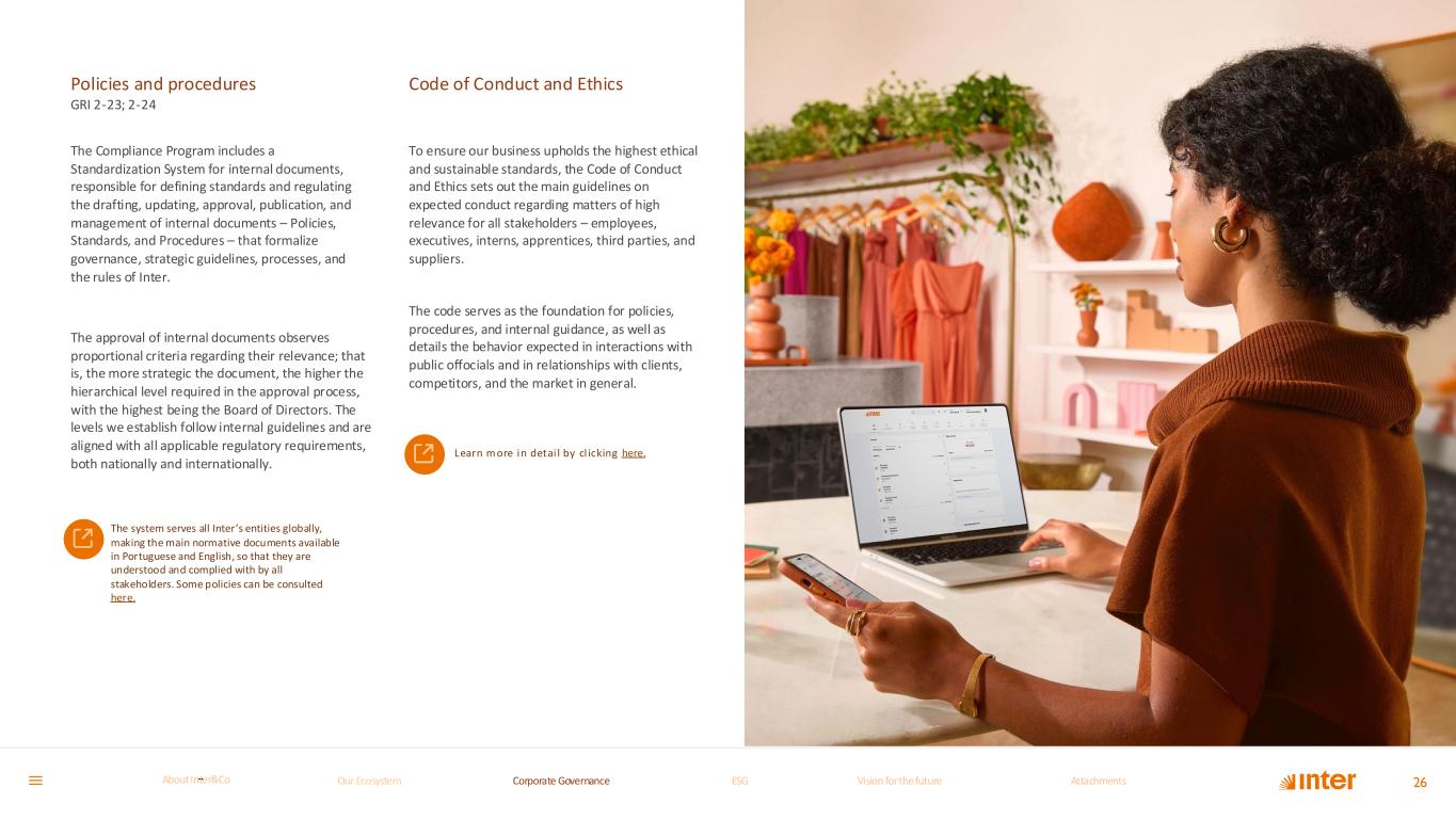 Policies and procedures GRI 2-23; 2-24 The Compliance Program includes a Standardization System for internal documents, responsible for defining standards and regulating the drafting, updating, approval, publication, and management of internal documents – Policies, Standards, and Procedures – that formalize governance, strategic guidelines, processes, and the rules of Inter. The approval of internal documents observes proportional criteria regarding their relevance; that is, the more strategic the document, the higher the hierarchical level required in the approval process, with the highest being the Board of Directors. The levels we establish follow internal guidelines and are aligned with all applicable regulatory requirements, both nationally and internationally. Code of Conduct and Ethics To ensure our business upholds the highest ethical and sustainable standards, the Code of Conduct and Ethics sets out the main guidelines on expected conduct regarding matters of high relevance for all stakeholders – employees, executives, interns, apprentices, third parties, and suppliers. The code serves as the foundation for policies, procedures, and internal guidance, as well as details the behavior expected in interactions with public offocials and in relationships with clients, competitors, and the market in general. The system serves all Inter’s entities globally, making the main normative documents available in Portuguese and English, so that they are understood and complied with by all stakeholders. Some policies can be consulted here. Learn m ore in detai l by cl icking here. 26Our Ecosystem Corporate GovernanceCorporate Governance ESGESG Vision for the futureVision for the future AttachmentsAttachments About InterCoAbout Inter&Co