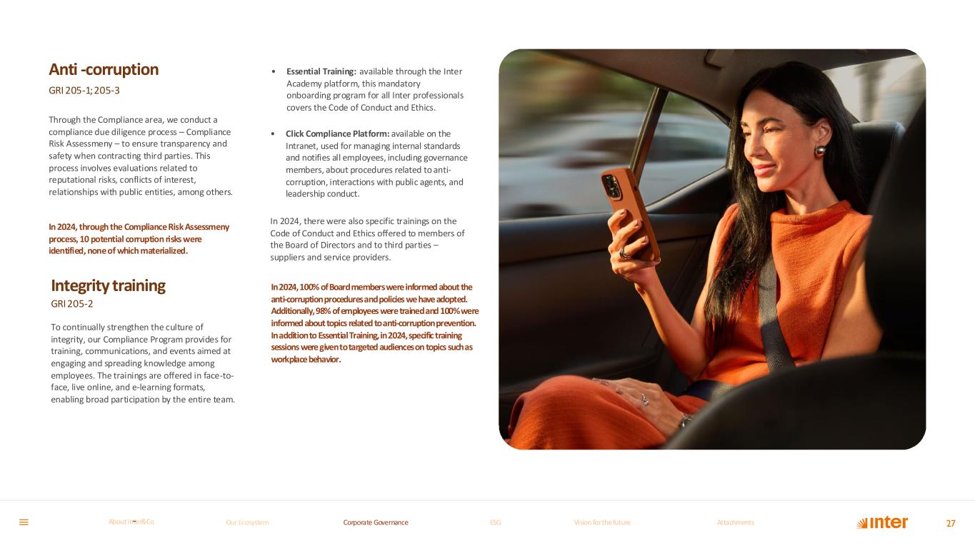 Anti -corruption GRI 205-1;205-3 Through the Compliance area, we conduct a compliance due diligence process – Compliance Risk Assessmeny – to ensure transparency and safety when contracting third parties. This process involves evaluations related to reputational risks, conflicts of interest, relationships with public entities, among others. In 2024, through the Compliance Risk Assessmeny process, 10 potential corruption risks were identified, none of which materialized. Integrity training GRI205-2 To continually strengthen the culture of integrity, our Compliance Program provides for training, communications, and events aimed at engaging and spreading knowledge among employees. The trainings are offered in face-to- face, live online, and e-learning formats, enabling broad participation by the entire team. • Essential Training: available through the Inter Academy platform, this mandatory onboarding program for all Inter professionals covers the Code of Conduct and Ethics. • Click Compliance Platform: available on the Intranet, used for managing internal standards and notifies all employees, including governance members, about procedures related to anti- corruption, interactions with public agents, and leadership conduct. In 2024, there were also specific trainings on the Code of Conduct and Ethics offered to members of the Board of Directors and to third parties – suppliers and service providers. In 2024, 100% of Board members were informed about the anti-corruption procedures and policies we have adopted. Additionally, 98% of employees were trained and 100% were informed about topics related to anti-corruption prevention. In addition to Essential Training, in 2024, specific training sessions were given to targeted audiences on topics such as workplace behavior. 27Our Ecosystem Corporate GovernanceCorporate Governance ESGESG Vision for the futureVision for the future AttachmentsAttachments About InterCoAbout Inter&Co
