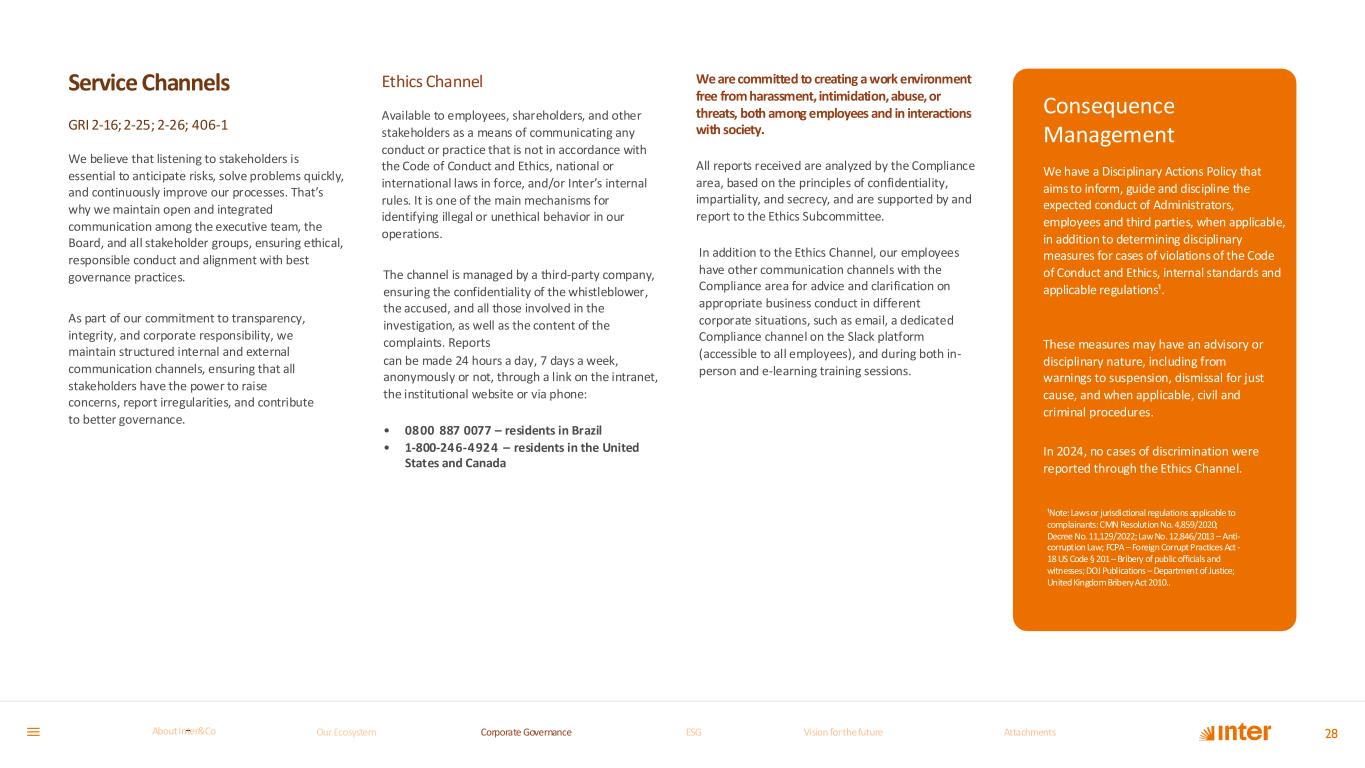 Service Channels GRI 2-16;2-25; 2-26; 406-1 We believe that listening to stakeholders is essential to anticipate risks, solve problems quickly, and continuously improve our processes. That’s why we maintain open and integrated communication among the executive team, the Board, and all stakeholder groups, ensuring ethical, responsible conduct and alignment with best governance practices. As part of our commitment to transparency, integrity, and corporate responsibility, we maintain structured internal and external communication channels, ensuring that all stakeholders have the power to raise concerns, report irregularities, and contribute to better governance. Ethics Channel Available to employees, shareholders, and other stakeholders as a means of communicating any conduct or practice that is not in accordance with the Code of Conduct and Ethics, national or international laws in force, and/or Inter’s internal rules. It is one of the main mechanisms for identifying illegal or unethical behavior in our operations. The channel is managed by a third-party company, ensuring the confidentiality of the whistleblower, the accused, and all those involved in the investigation, as well as the content of the complaints. Reports can be made 24 hours a day, 7 days a week, anonymously or not, through a link on the intranet, the institutional website or via phone: • 0800 887 0077 – residents in Brazil • 1-800-246-4924 – residents in the United States and Canada We are committed to creating a work environment free from harassment, intimidation, abuse, or threats, both among employees and in interactions with society. All reports received are analyzed by the Compliance area, based on the principles of confidentiality, impartiality, and secrecy, and are supported by and report to the Ethics Subcommittee. In addition to the Ethics Channel, our employees have other communication channels with the Compliance area for advice and clarification on appropriate business conduct in different corporate situations, such as email, a dedicated Compliance channel on the Slack platform (accessible to all employees), and during both in- person and e-learning training sessions. Consequence Management We have a Disciplinary Actions Policy that aims to inform, guide and discipline the expected conduct of Administrators, employees and third parties, when applicable, in addition to determining disciplinary measures for cases of violations of the Code of Conduct and Ethics, internal standards and applicable regulations¹. 28 These measures may have an advisory or disciplinary nature, including from warnings to suspension, dismissal for just cause, and when applicable, civil and criminal procedures. In 2024, no cases of discrimination were reported through the Ethics Channel. ¹Note: Laws or jurisdictional regulations applicable to complainants: CMN Resolution No. 4,859/2020; Decree No. 11,129/2022; Law No. 12,846/2013 – Anti- corruption Law; FCPA – Foreign Corrupt Practices Act - 18 US Code § 201 – Bribery of public officials and witnesses; DOJ Publications – Department of Justice; United Kingdom Bribery Act 2010.. Our Ecosystem Corporate GovernanceCorporate Governance ESGESG Vision for the futureVision for the future AttachmentsAttachments About InterCoAbout Inter&Co
