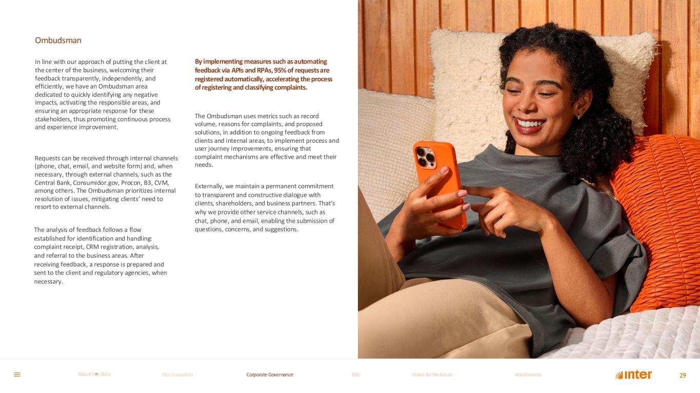 Ombudsman In line with our approach of putting the client at the center of the business, welcoming their feedback transparently, independently, and efficiently, we have an Ombudsman area dedicated to quickly identifying any negative impacts, activating the responsible areas, and ensuring an appropriate response for these stakeholders, thus promoting continuous process and experience improvement. Requests can be received through internal channels (phone, chat, email, and website form) and, when necessary, through external channels, such as the Central Bank, Consumidor.gov, Procon, B3, CVM, among others. The Ombudsman prioritizes internal resolution of issues, mitigating clients’ need to resort to external channels. The analysis of feedback follows a flow established for identification and handling: complaint receipt, CRM registration, analysis, and referral to the business areas. After receiving feedback, a response is prepared and sent to the client and regulatory agencies, when necessary. By implementing measures such as automating feedback via APIs and RPAs, 95% of requests are registered automatically, accelerating the process of registering and classifying complaints. The Ombudsman uses metrics such as record volume, reasons for complaints, and proposed solutions, in addition to ongoing feedback from clients and internal areas, to implement process and user journey improvements, ensuring that complaint mechanisms are effective and meet their needs. Externally, we maintain a permanent commitment to transparent and constructive dialogue with clients, shareholders, and business partners. That’s why we provide other service channels, such as chat, phone, and email, enabling the submission of questions, concerns, and suggestions. 29Our Ecosystem Corporate GovernanceCorporate Governance ESGESG Vision for the futureVision for the future AttachmentsAttachments About InterCoAbout Inter&Co