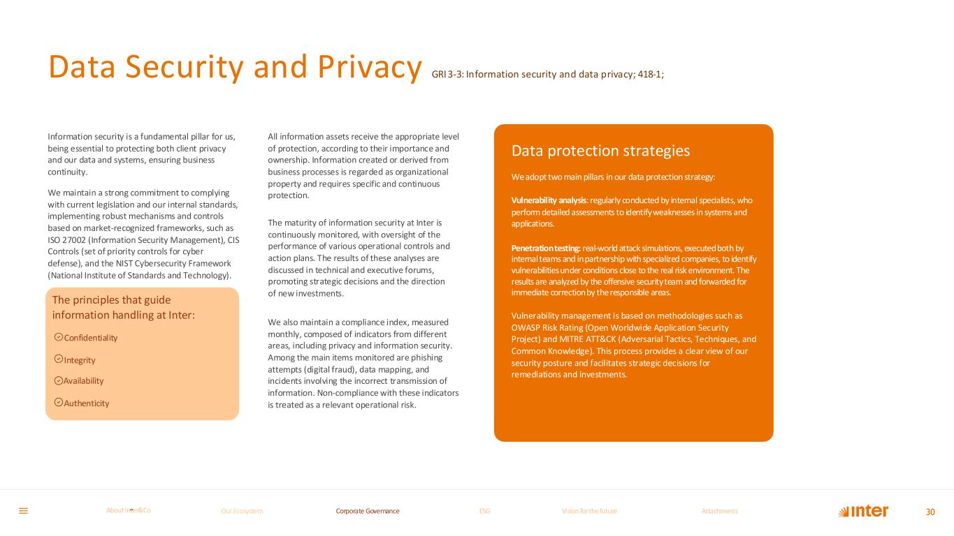 Information security is a fundamental pillar for us, being essential to protecting both client privacy and our data and systems, ensuring business continuity. We maintain a strong commitment to complying with current legislation and our internal standards, implementing robust mechanisms and controls based on market-recognized frameworks, such as ISO 27002 (Information Security Management), CIS Controls (set of priority controls for cyber defense), and the NIST Cybersecurity Framework (National Institute of Standards and Technology). All information assets receive the appropriate level of protection, according to their importance and ownership. Information created or derived from business processes is regarded as organizational property and requires specific and continuous protection. The maturity of information security at Inter is continuously monitored, with oversight of the performance of various operational controls and action plans. The results of these analyses are discussed in technical and executive forums, promoting strategic decisions and the direction of new investments. We also maintain a compliance index, measured monthly, composed of indicators from different areas, including privacy and information security. Among the main items monitored are phishing attempts (digital fraud), data mapping, and incidents involving the incorrect transmission of information. Non-compliance with these indicators is treated as a relevant operational risk. Data Security and Privacy GRI3-3: Information security and data privacy; 418-1; Data protection strategies We adopt two main pillars in our data protection strategy: Vulnerability analysis: regularly conducted by internal specialists, who perform detailed assessments to identify weaknesses in systems and applications. Penetration testing: real-world attack simulations, executed both by internal teams and in partnership with specialized companies, to identify vulnerabilities under conditions close to the real risk environment. The results are analyzed by the offensive security team and forwarded for immediate correction by the responsible areas. Vulnerability management is based on methodologies such as OWASP Risk Rating (Open Worldwide Application Security Project) and MITRE ATT&CK (Adversarial Tactics, Techniques, and Common Knowledge). This process provides a clear view of our security posture and facilitates strategic decisions for remediations and investments. 30 Our Ecosystem Our Ecosystem The principles that guide information handling at Inter: Confidentiality Integrity Availability Authenticity Our Ecosystem Corporate GovernanceCorporate Governance ESGESG Vision for the futureVision for the future AttachmentsAttachments About InterCoAbout Inter&Co