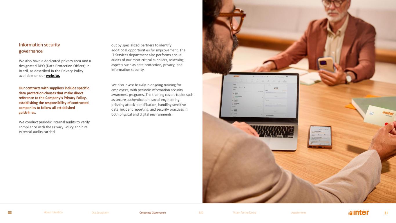 Information security governance We also have a dedicated privacy area and a designated DPO (Data Protection Officer) in Brazil, as described in the Privacy Policy available on our website. Our contracts with suppliers include specific data protection clauses that make direct reference to the Company’s Privacy Policy, establishing the responsibility of contracted companies to follow all established guidelines. We conduct periodic internal audits to verify compliance with the Privacy Policy and hire external audits carried out by specialized partners to identify additional opportunities for improvement. The IT Services department also performs annual audits of our most critical suppliers, assessing aspects such as data protection, privacy, and information security. We also invest heavily in ongoing training for employees, with periodic information security awareness programs. The training covers topics such as secure authentication, social engineering, phishing attack identification, handling sensitive data, incident reporting, and security practices in both physical and digital environments. 31Our Ecosystem Corporate GovernanceCorporate Governance ESGESG Vision for the futureVision for the future AttachmentsAttachments About InterCoAbout Inter&Co