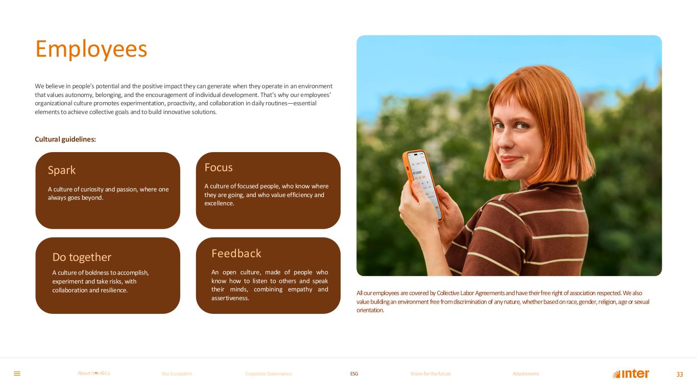 Employees We believe in people’s potential and the positive impact they can generate when they operate in an environment that values autonomy, belonging, and the encouragement of individual development. That’s why our employees’ organizational culture promotes experimentation, proactivity, and collaboration in daily routines—essential elements to achieve collective goals and to build innovative solutions. Cultural guidelines: Feedback An open culture, made of people who know how to listen to others and speak their minds, combining empathy and assertiveness. Spark A culture of curiosity and passion, where one always goes beyond. 33 Focus A culture of focused people, who know where they are going, and who value efficiency and excellence. Do together A culture of boldness to accomplish, experiment and take risks, with collaboration and resilience. All our employees are covered by Collective Labor Agreements and have their free right of association respected. We also value building an environment free from discrimination of any nature, whether based on race, gender, religion, age or sexual orientation. Our Ecosystem Corporate GovernanceCorporate Governance ESGESG Vision for the futureVision for the future AttachmentsAttachments About InterCoAbout Inter&Co