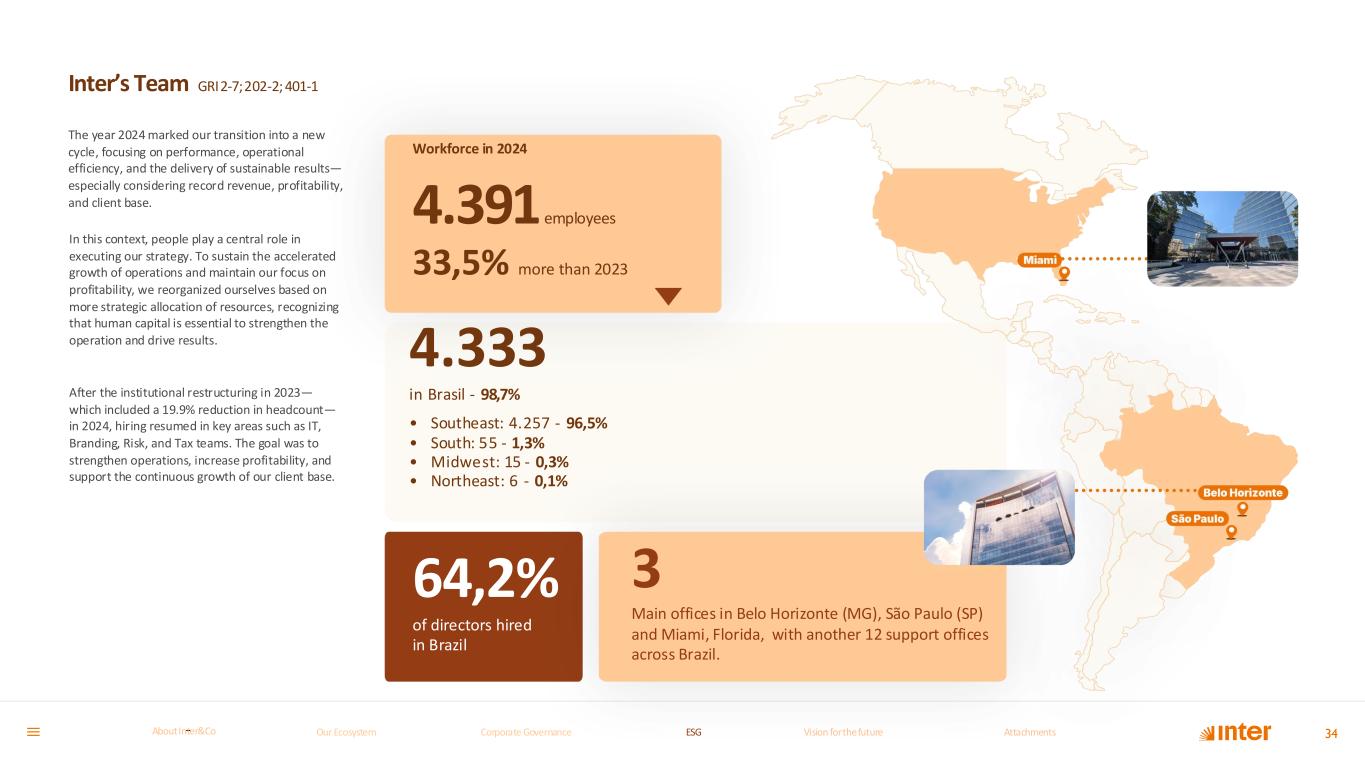 The year 2024 marked our transition into a new cycle, focusing on performance, operational efficiency, and the delivery of sustainable results— especially considering record revenue, profitability, and client base. In this context, people play a central role in executing our strategy. To sustain the accelerated growth of operations and maintain our focus on profitability, we reorganized ourselves based on more strategic allocation of resources, recognizing that human capital is essential to strengthen the operation and drive results. After the institutional restructuring in 2023— which included a 19.9% reduction in headcount— in 2024, hiring resumed in key areas such as IT, Branding, Risk, and Tax teams. The goal was to strengthen operations, increase profitability, and support the continuous growth of our client base. Inter’s Team GRI2-7;202-2; 401-1 64,2% of directors hi red in Bra zil 34 Workforce in 2024 4.391employees 33,5% more than 2023 3 Main offices in Belo Horizonte (MG), São Paulo (SP) and Miami, Florida, with another 12 support offices across Brazil. 4.333 in Brasil - 98,7% • Southeast: 4.257 - 96,5% • South: 55 - 1,3% • Midwest: 15 - 0,3% • Northeast: 6 - 0,1% 64,2% of directors hired in Brazil Our Ecosystem Corporate GovernanceCorporate Governance ESGESG Vision for the futureVision for the future AttachmentsAttachments About InterCoAbout Inter&Co