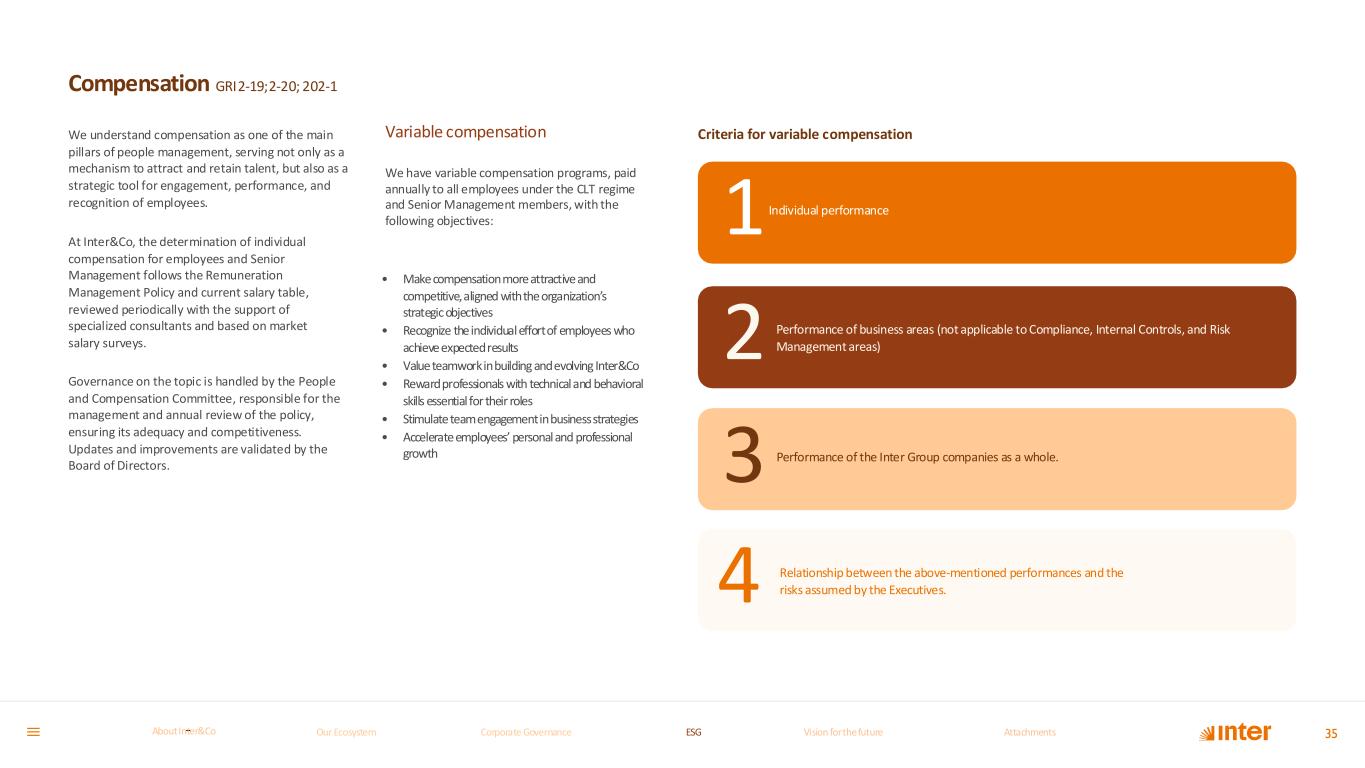 Individual performance 35 Performance of business areas (not applicable to Compliance, Internal Controls, and Risk Management areas) Performance of the Inter Group companies as a whole. We understand compensation as one of the main pillars of people management, serving not only as a mechanism to attract and retain talent, but also as a strategic tool for engagement, performance, and recognition of employees. At Inter&Co, the determination of individual compensation for employees and Senior Management follows the Remuneration Management Policy and current salary table, reviewed periodically with the support of specialized consultants and based on market salary surveys. Governance on the topic is handled by the People and Compensation Committee, responsible for the management and annual review of the policy, ensuring its adequacy and competitiveness. Updates and improvements are validated by the Board of Directors. Variable compensation We have variable compensation programs, paid annually to all employees under the CLT regime and Senior Management members, with the following objectives: • Make compensation more attractive and competitive, aligned with the organization’s strategic objectives • Recognize the individual effort of employees who achieve expected results • Value teamwork in building and evolving Inter&Co • Reward professionals with technical and behavioral skills essential for their roles • Stimulate team engagement in business strategies • Accelerate employees’ personal and professional growth Compensation GRI2-19;2-20; 202-1 Criteria for variable compensation 1 2 3 4 Relationship between the above-mentioned performances and the risks assumed by the Executives. Our Ecosystem Corporate GovernanceCorporate Governance ESGESG Vision for the futureVision for the future AttachmentsAttachments About InterCoAbout Inter&Co
