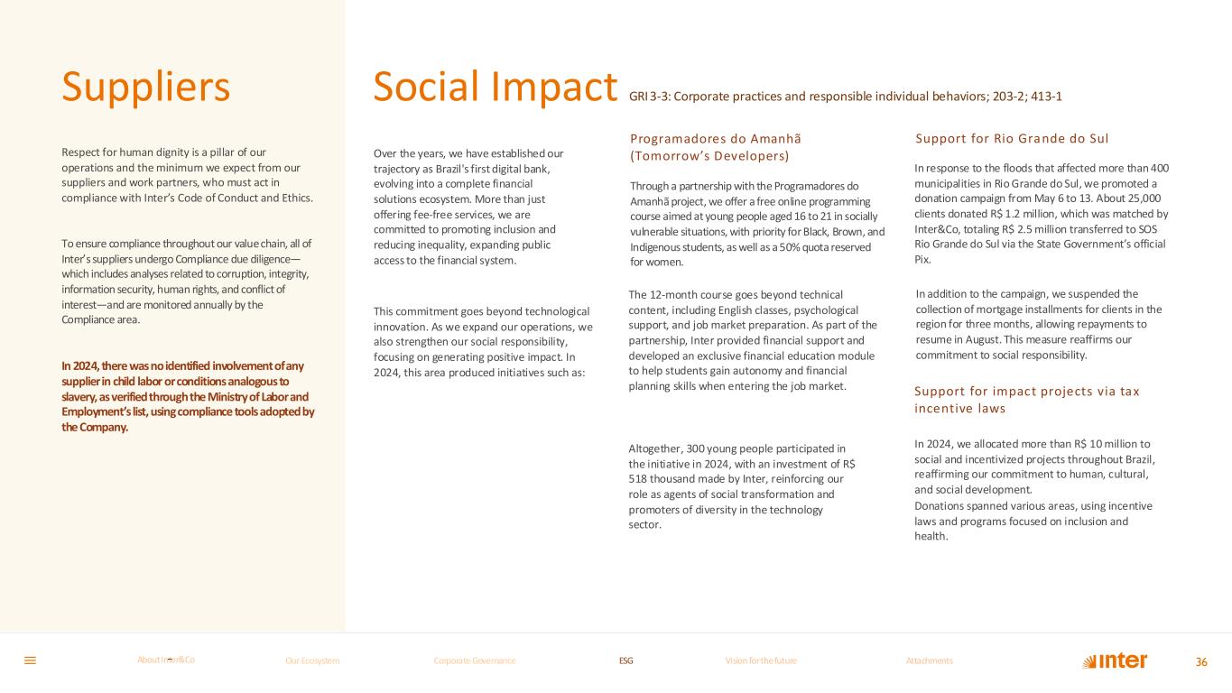 Suppliers 36 Respect for human dignity is a pillar of our operations and the minimum we expect from our suppliers and work partners, who must act in compliance with Inter’s Code of Conduct and Ethics. To ensure compliance throughout our value chain, all of Inter’s suppliers undergo Compliance due diligence— which includes analyses related to corruption, integrity, information security, human rights, and conflict of interest—and are monitored annually by the Compliance area. In 2024, there was no identified involvement of any supplier in child labor or conditions analogous to slavery, as verified through the Ministry of Labor and Employment’s list, using compliance tools adopted by the Company. Over the years, we have established our trajectory as Brazil's first digital bank, evolving into a complete financial solutions ecosystem. More than just offering fee-free services, we are committed to promoting inclusion and reducing inequality, expanding public access to the financial system. This commitment goes beyond technological innovation. As we expand our operations, we also strengthen our social responsibility, focusing on generating positive impact. In 2024, this area produced initiatives such as: Programadores do Amanhã (Tomorrow’s Developers) Through a partnership with the Programadores do Amanhã project, we offer a free online programming course aimed at young people aged 16 to 21 in socially vulnerable situations, with priority for Black, Brown, and Indigenous students, as well as a 50% quota reserved for women. The 12-month course goes beyond technical content, including English classes, psychological support, and job market preparation. As part of the partnership, Inter provided financial support and developed an exclusive financial education module to help students gain autonomy and financial planning skills when entering the job market. Altogether, 300 young people participated in the initiative in 2024, with an investment of R$ 518 thousand made by Inter, reinforcing our role as agents of social transformation and promoters of diversity in the technology sector. Support for Rio Grande do Sul In response to the floods that affected more than 400 municipalities in Rio Grande do Sul, we promoted a donation campaign from May 6 to 13. About 25,000 clients donated R$ 1.2 million, which was matched by Inter&Co, totaling R$ 2.5 million transferred to SOS Rio Grande do Sul via the State Government’s official Pix. In addition to the campaign, we suspended the collection of mortgage installments for clients in the region for three months, allowing repayments to resume in August. This measure reaffirms our commitment to social responsibility. Support for impact projects via tax incentive laws In 2024, we allocated more than R$ 10 million to social and incentivized projects throughout Brazil, reaffirming our commitment to human, cultural, and social development. Donations spanned various areas, using incentive laws and programs focused on inclusion and health. Social Impact GRI 3-3: Corporate practices and responsible individual behaviors; 203-2; 413-1 Our Ecosystem Corporate GovernanceCorporate Governance ESGESG Vision for the futureVision for the future AttachmentsAttachments About InterCoAbout Inter&Co