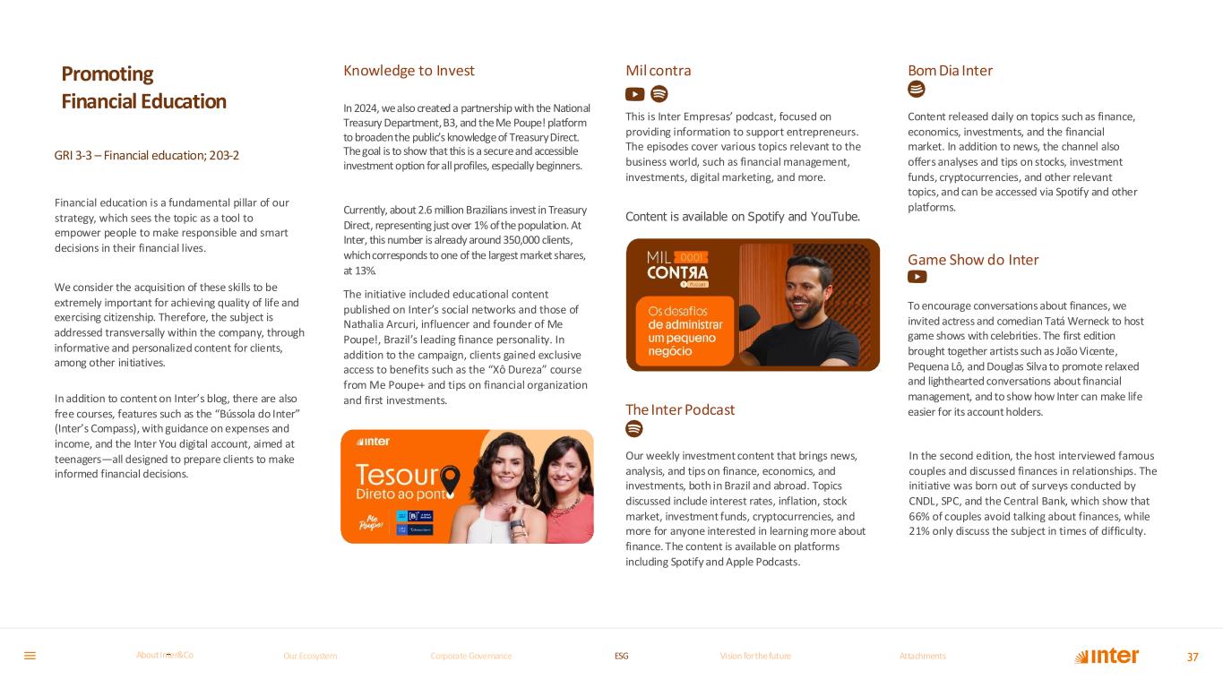 Promoting Financial Education GRI 3-3 – Financial education; 203-2 Financial education is a fundamental pillar of our strategy, which sees the topic as a tool to empower people to make responsible and smart decisions in their financial lives. We consider the acquisition of these skills to be extremely important for achieving quality of life and exercising citizenship. Therefore, the subject is addressed transversally within the company, through informative and personalized content for clients, among other initiatives. In addition to content on Inter’s blog, there are also free courses, features such as the “Bússola do Inter” (Inter’s Compass), with guidance on expenses and income, and the Inter You digital account, aimed at teenagers—all designed to prepare clients to make informed financial decisions. Knowledge to Invest In 2024, we also created a partnership with the National Treasury Department, B3, and the Me Poupe! platform to broaden the public’s knowledge of Treasury Direct. The goal is to show that this is a secure and accessible investment option for all profiles, especially beginners. Currently, about 2.6 million Brazilians invest in Treasury Direct, representing just over 1% of the population. At Inter, this number is already around 350,000 clients, which corresponds to one of the largest market shares, at 13%. The initiative included educational content published on Inter’s social networks and those of Nathalia Arcuri, influencer and founder of Me Poupe!, Brazil’s leading finance personality. In addition to the campaign, clients gained exclusive access to benefits such as the “Xô Dureza” course from Me Poupe+ and tips on financial organization and first investments. Mil contra This is Inter Empresas’ podcast, focused on providing information to support entrepreneurs. The episodes cover various topics relevant to the business world, such as financial management, investments, digital marketing, and more. Content is available on Spotify and YouTube. The Inter Podcast Our weekly investment content that brings news, analysis, and tips on finance, economics, and investments, both in Brazil and abroad. Topics discussed include interest rates, inflation, stock market, investment funds, cryptocurrencies, and more for anyone interested in learning more about finance. The content is available on platforms including Spotify and Apple Podcasts. Bom Dia Inter Content released daily on topics such as finance, economics, investments, and the financial market. In addition to news, the channel also offers analyses and tips on stocks, investment funds, cryptocurrencies, and other relevant topics, and can be accessed via Spotify and other platforms. Game Show do Inter To encourage conversations about finances, we invited actress and comedian Tatá Werneck to host game shows with celebrities. The first edition brought together artists such as João Vicente, Pequena Lô, and Douglas Silva to promote relaxed and lighthearted conversations about financial management, and to show how Inter can make life easier for its account holders. In the second edition, the host interviewed famous couples and discussed finances in relationships. The initiative was born out of surveys conducted by CNDL, SPC, and the Central Bank, which show that 66% of couples avoid talking about finances, while 21% only discuss the subject in times of difficulty. 37Our Ecosystem Corporate GovernanceCorporate Governance ESGESG Vision for the futureVision for the future AttachmentsAttachments About InterCoAbout Inter&Co