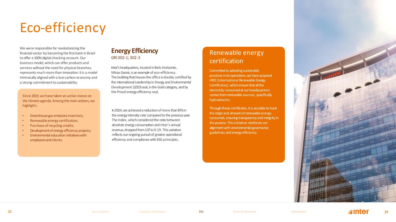 Energy Efficiency GRI302-1; 302-3 We were responsible for revolutionizing the financial sector by becoming the first bank in Brazil to offer a 100%digital checking account. Our business model, which can offer products and services without the need for physical branches, represents much more than innovation: it is a model intrinsically aligned with a low-carbon economy and a strong commitment to sustainability. 39 Inter’sheadquarters, located inBelo Horizonte, Minas Gerais, is anexample of eco-efficiency. The buildingthat housesthe office isdoubly certified by the international Leadership in Energy and Environmental Development (LEED)seal, inthe Goldcategory, and by the Procel energyefficiency seal. In2024, we achieveda reduction of more than87%in the energyintensity rate comparedto the previousyear. The index, whichconsidered the ratio between absolute energyconsumption and Inter’s annual revenue, dropped from1.57to 0.19. This variation reflects ourongoing pursuitof greater operational efficiency and compliance with ESG principles. Renewable energy certification Committed to adoptingsustainable practices inits operations, we have acquired I-REC (International Renewable Energy Certificates), whichensure that all the electricity consumedat ourheadquarters comes fromrenewable sources, specifically hydroelectric. Throughthese certificates, it is possible to track theorigin and amountof renewable energy consumed, ensuring transparency and integrity in theprocess. This initiative reinforces our alignmentwith environmental governance guidelines and energyefficiency. Eco-efficiency Since 2019,we have taken an active stance on the climate agenda. Among the main actions, we highlight:: • Greenhousegas emissions inventory; • Renewable energy certification; • Purchase of recycling credits; • Developmentof energyefficiency projects; • Environmental education initiatives with employeesand clients. Our Ecosystem Corporate GovernanceCorporate Governance ESGESG Vision for the futureVision for the future AttachmentsAttachments