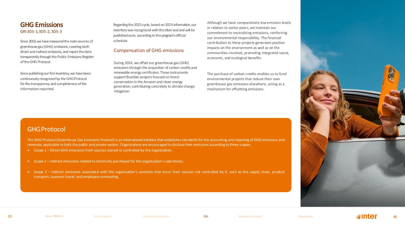 GRI305-1;305-2; 305-3 Compensation of GHG emissions During 2024, we offset our greenhouse gas (GHG) emissions through the acquisition of carbon credits and renewable energy certificates. These instruments support Brazilian projects focused on forest conservation in the Amazon and clean energy generation, contributing concretely to climate change mitigation. Although we have comparatively low emission levels in relation to sector peers, we maintain our commitment to neutralizing emissions, reinforcing our environmental responsibility. The financial contribution to these projects generates positive impacts on the environment as well as on the communities involved, promoting integrated social, economic, and ecological benefits. The purchase of carbon credits enables us to fund environmental projects that reduce their own greenhouse gas emissions elsewhere, acting as a mechanism for offsetting emissions. GHGProtocol The GHG Protocol (Greenhouse Gas Emissions Protocol) is an international initiative that establishes standards for the accounting and reporting of GHG emissions and removals, applicable to both the public and private sectors. Organizations are encouraged to disclose their emissions according to three scopes: • Scope 1 – Direct GHG emissions from sources owned or controlled by the organization; • Scope 2 – Indirect emissions related to electricity purchased for the organization’s operations; • Scope 3 – Indirect emissions associated with the organization’s activities that occur from sources not controlled by it, such as the supply chain, product transport, business travel, and employee commuting. GHG Emissions 40 Since 2019,we havemeasured themain sources of greenhouse gas (GHG) emissions, covering both direct and indirect emissions, and report thedata transparently through the Public EmissionsRegister of theGHG Protocol. Since publishing ourfirst inventory,we havebeen continuously recognized by the GHGProtocol for the transparency and completenessof the information reported. Regardingthe2025 cycle, based on2024 information,our inventorywasrecognized with thesilversealand will be publishedsoon, according to the program’sofficial schedule. Our Ecosystem Corporate GovernanceCorporate Governance ESGESG Vision for the futureVision for the future AttachmentsAttachments About InterCoAbout Inter&Co
