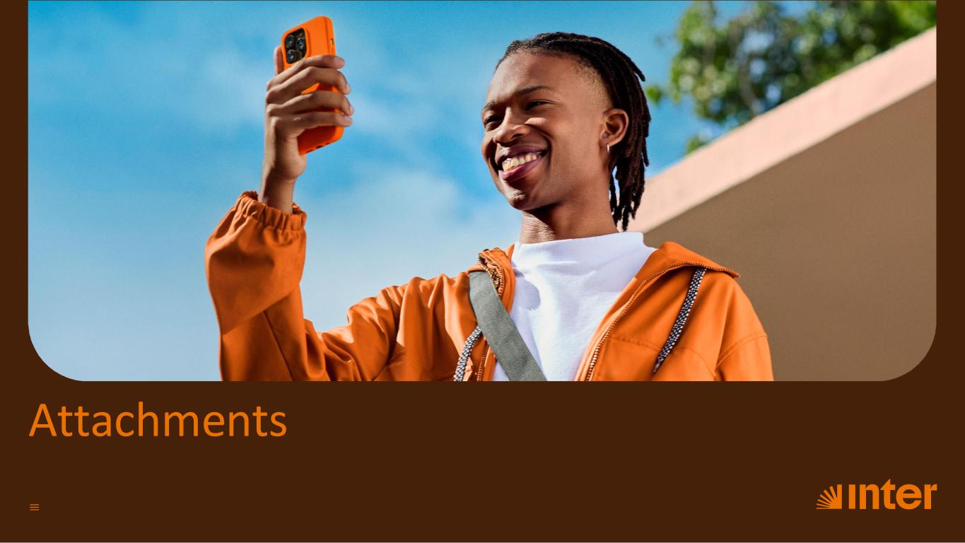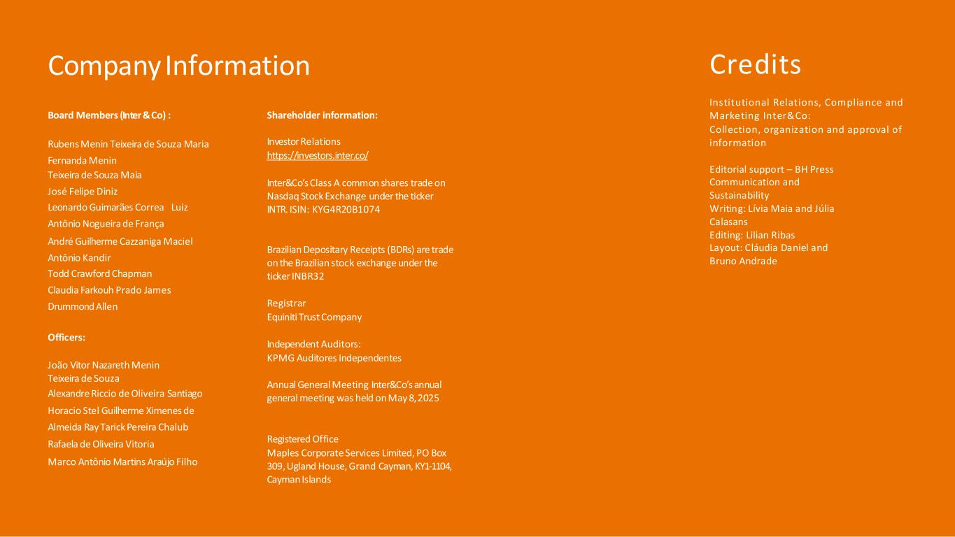 Credits Board Members (Inter&Co) : Rubens Menin Teixeira de Souza Maria Fernanda Menin Teixeira de Souza Maia José Felipe Diniz Leonardo Guimarães Correa Luiz Antônio Nogueira de França André Guilherme Cazzaniga Maciel Antônio Kandir Todd Crawford Chapman Claudia Farkouh Prado James Drummond Allen Officers: João Vitor Nazareth Menin Teixeira de Souza Alexandre Riccio de Oliveira Santiago Horacio Stel Guilherme Ximenes de Almeida Ray Tarick Pereira Chalub Rafaela de Oliveira Vitoria Marco Antônio Martins Araújo Filho Shareholder information: InvestorRelations https://investors.inter.co/ Inter&Co’s Class A common shares trade on Nasdaq Stock Exchange under the ticker INTR. ISIN: KYG4R20B1074 Brazilian Depositary Receipts (BDRs) are trade on the Brazilian stock exchange under the ticker INBR32 Registrar Equiniti Trust Company Independent Auditors: KPMG Auditores Independentes Annual General Meeting Inter&Co’s annual general meeting was held on May 8, 2025 Registered Office Maples Corporate Services Limited, PO Box 309,Ugland House, Grand Cayman, KY1-1104, Cayman Islands CompanyInformation Institutional Relations, Compliance and Marketing Inter&Co: Collection, organization and approval of information Editorial support – BH Press Communication and Sustainability Writing: Lívia Maia and Júlia Calasans Editing: Lilian Ribas Layout: Cláudia Daniel and Bruno Andrade
