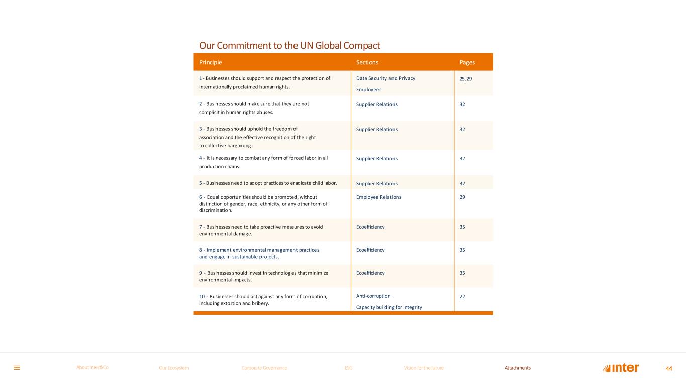 44 Principle Sections Pages 1 - Businesses should support and respect the protection of internationally proclaimed human rights. Data Security and Privacy Employees 25,29 2 - Businesses should make sure that they are not complicit in human rights abuses. Supplier Relations 32 3 - Businesses should uphold the freedom of association and the effective recognition of the right to collective bargaining.. Supplier Relations 32 4 - It is necessary to combat any form of forced labor in all production chains. Supplier Relations 32 5 - Businesses need to adopt practices to eradicate child labor. Supplier Relations 32 6 - Equal opportunities should be promoted, without distinction of gender, race, ethnicity, or any other form of discrimination. Employee Relations 29 7 - Businesses need to take proactive measures to avoid environmental damage. Ecoefficiency 35 8 - Implement environmental management practices and engage in sustainable projects. Ecoefficiency 35 9 - Businesses should invest in technologies that minimize environmental impacts. Ecoefficiency 35 10 - Businesses should act against any form of corruption, including extortion and bribery. Anti-corruption Capacity building for integrity 22 Our Commitment to the UN Global Compact Our Ecosystem Corporate GovernanceCorporate Governance ESGESG Vision for the futureVision for the future AttachmentsAttachments About InterCoAbout Inter&Co
