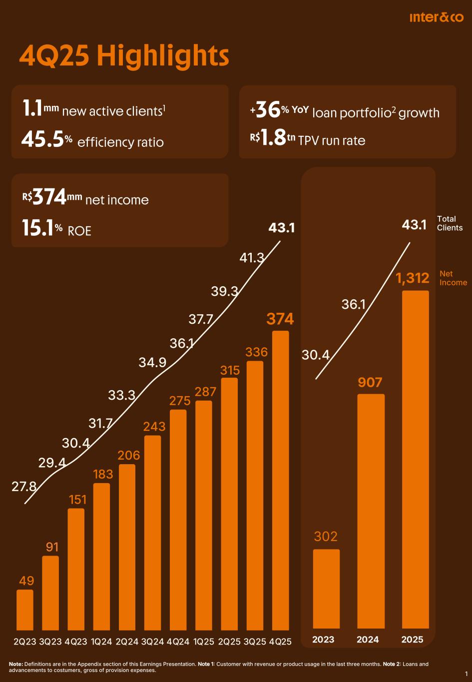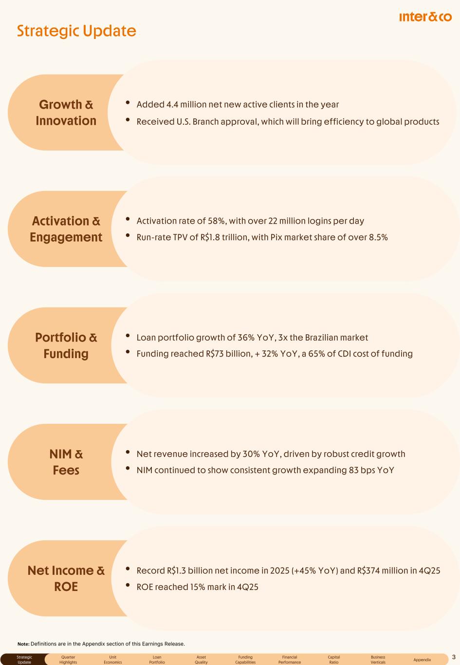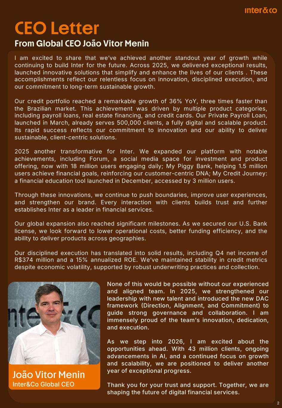 From Global CEO João Vitor Menin CEO Letter 2 I am excited to share that we’ve achieved another standout year of growth while continuing to build Inter for the future. Across 2025, we delivered exceptional results, launched innovative solutions that simplify and enhance the lives of our clients . These accomplishments reflect our relentless focus on innovation, disciplined execution, and our commitment to long-term sustainable growth. Our credit portfolio reached a remarkable growth of 36% YoY, three times faster than the Brazilian market. This achievement was driven by multiple product categories, including payroll loans, real estate financing, and credit cards. Our Private Payroll Loan, launched in March, already serves 500,000 clients, a fully digital and scalable product. Its rapid success reflects our commitment to innovation and our ability to deliver sustainable, client-centric solutions. 2025 another transformative for Inter. We expanded our platform with notable achievements, including Forum, a social media space for investment and product offering, now with 18 million users engaging daily; My Piggy Bank, helping 1.5 million users achieve financial goals, reinforcing our customer-centric DNA; My Credit Journey: a financial education tool launched in December, accessed by 3 million users. Through these innovations, we continue to push boundaries, improve user experiences, and strengthen our brand. Every interaction with clients builds trust and further establishes Inter as a leader in financial services. Our global expansion also reached significant milestones. As we secured our U.S. Bank license, we look forward to lower operational costs, better funding efficiency, and the ability to deliver products across geographies. Our disciplined execution has translated into solid results, including Q4 net income of R$374 million and a 15% annualized ROE. We’ve maintained stability in credit metrics despite economic volatility, supported by robust underwriting practices and collection. João Vitor Menin Inter&Co Global CEO None of this would be possible without our experienced and aligned team. In 2025, we strengthened our leadership with new talent and introduced the new DAC framework Direction, Alignment, and Commitment) to guide strong governance and collaboration. I am immensely proud of the team’s innovation, dedication, and execution. As we step into 2026, I am excited about the opportunities ahead. With 43 million clients, ongoing advancements in AI, and a continued focus on growth and scalability, we are positioned to deliver another year of exceptional progress. Thank you for your trust and support. Together, we are shaping the future of digital financial services.