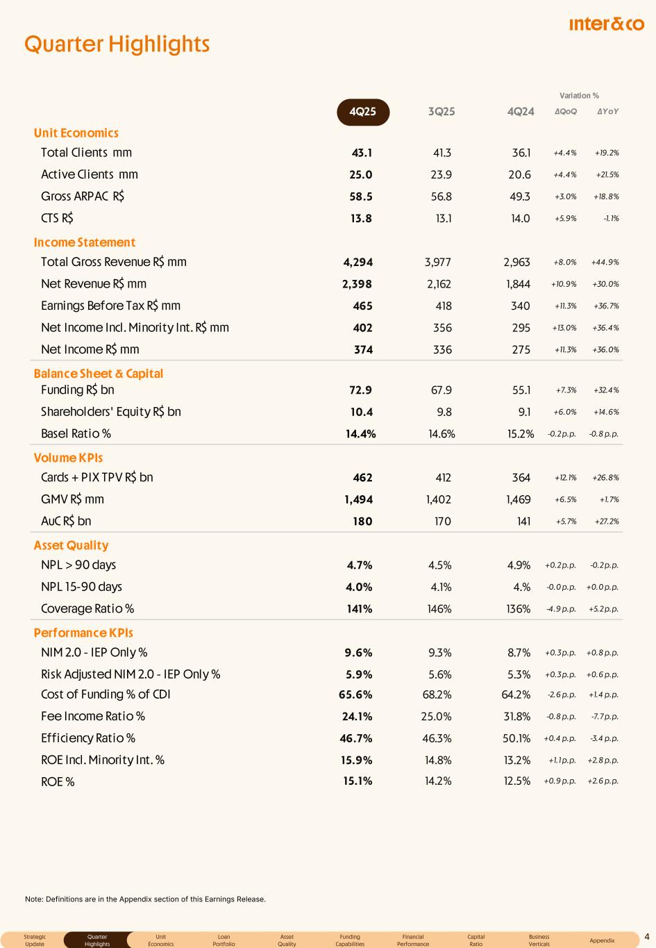 4Q25 3Q25 4Q24 ∆QoQ ∆YoY Unit Economics Total Clients mm 43.1 41.3 36.1 +4.4% +19.2% Active Clients mm 25.0 23.9 20.6 +4.4% +21.5% Gross ARPAC R$ 58.5 56.8 49.3 +3.0% +18.8% CTS R$ 13.8 13.1 14.0 +5.9% -1.1% Income Statement Total Gross Revenue R$ mm 4,294 3,977 2,963 +8.0% +44.9% Net Revenue R$ mm 2,398 2,162 1,844 +10.9% +30.0% Earnings Before Tax R$ mm 465 418 340 +11.3% +36.7% Net Income Incl. Minority Int. R$ mm 402 356 295 +13.0% +36.4% Net Income R$ mm 374 336 275 +11.3% +36.0% Balance Sheet & Capital Variation % Funding R$ bn 72.9 67.9 55.1 +7.3% +32.4% Shareholders' Equity R$ bn 10.4 9.8 9.1 +6.0% +14.6% Basel Ratio % 14.4% 14.6% 15.2% -0.2 p.p. -0.8 p.p. Volume KPIs Cards + PIX TPV R$ bn 462 412 364 +12.1% +26.8% GMV R$ mm 1,494 1,402 1,469 +6.5% +1.7% AuC R$ bn 180 170 141 +5.7% +27.2% Asset Quality NPL > 90 days 4.7% 4.5% 4.9% +0.2 p.p. -0.2 p.p. NPL 15-90 days 4.0% 4.1% 4.% -0.0 p.p. +0.0 p.p. Coverage Ratio % 141% 146% 136% -4.9 p.p. +5.2 p.p. Performance KPIs NIM 2.0 - IEP Only % 9.6% 9.3% 8.7% +0.3 p.p. +0.8 p.p. Risk Adjusted NIM 2.0 - IEP Only % 5.9% 5.6% 5.3% +0.3 p.p. +0.6 p.p. Cost of Funding % of CDI 65.6% 68.2% 64.2% -2.6 p.p. +1.4 p.p. Fee Income Ratio % 24.1% 25.0% 31.8% -0.8 p.p. -7.7 p.p. Efficiency Ratio % 46.7% 46.3% 50.1% +0.4 p.p. -3.4 p.p. ROE Incl. Minority Int. % 15.9% 14.8% 13.2% +1.1 p.p. +2.8 p.p. ROE % 15.1% 14.2% 12.5% +0.9 p.p. +2.6 p.p. Note: Definitions are in the Appendix section of this Earnings Release. Quarter Highlights Quarter Highlights Appendix Unit Economics Loan Portfolio Asset Quality Funding Capabilities Financial Performance Capital Ratio Business Verticals Strategic Update 4
