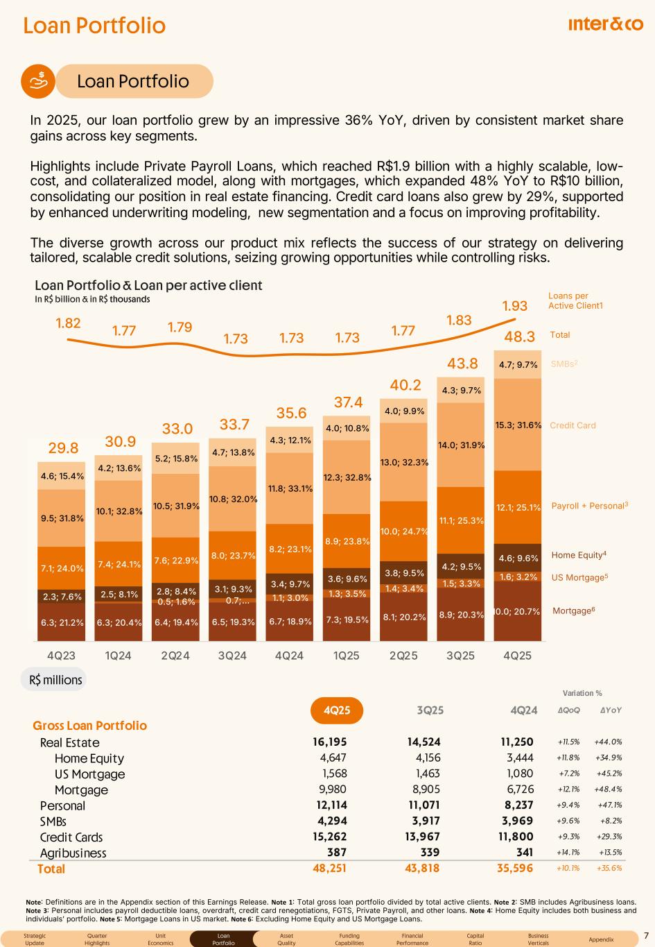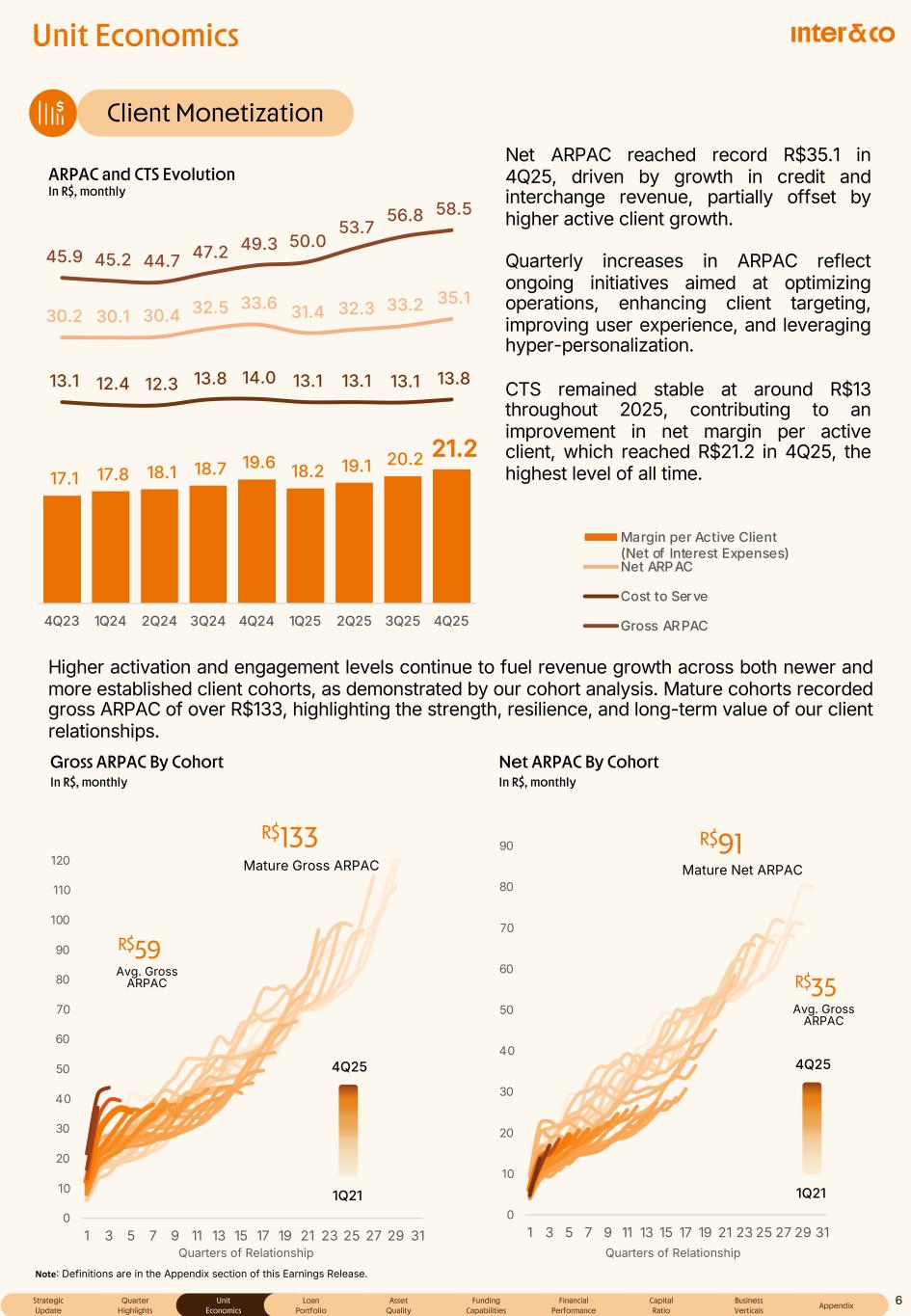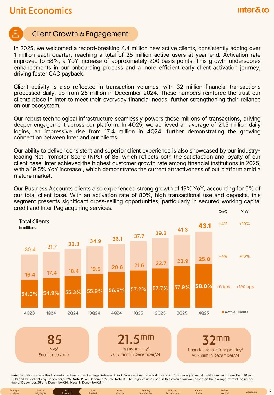 Note Definitions are in the Appendix section of this Earnings Release. Note 1 Source: Banco Central do Brazil. Considering financial institutions with more than 20 mm CCS and SCR clients by December/2025. Note 2: As December/2025. Note 3: The login volume used in this calculation was based on the average of total logins per day of December/25 and December/24. Note 4 December/25. Unit Economics Client Growth & Engagement 54.0% 54.9% 55.3% 55.9% 56.9% 57.2% 57.7% 57.9% 58.0% 16.4 17.4 18.4 19.5 20.6 21.6 22.7 23.9 25.0 30.4 31.7 33.3 34.9 36.1 37.7 39.3 41.3 43.1 1 .0 6 .0 1 1.0 1 6.0 2 1.0 2 6.0 3 1.0 3 6.0 4 1.0 4Q23 1Q24 2Q24 3Q24 4Q24 1Q25 2Q25 3Q25 4Q25 Active Clients QoQ YoY +4% +19% +4% +16% +6 bps +190 bps Total Clients In millions Quarter Highlights Appendix Unit Economics Loan Portfolio Asset Quality Funding Capabilities Financial Performance Capital Ratio Business Verticals Strategic Update 5 In 2025, we welcomed a record-breaking 4.4 million new active clients, consistently adding over 1 million each quarter, reaching a total of 25 million active users at year end. Activation rate improved to 58%, a YoY increase of approximately 200 basis points. This growth underscores enhancements in our onboarding process and a more efficient early client activation journey, driving faster CAC payback. Client activity is also reflected in transaction volumes, with 32 million financial transactions processed daily, up from 25 million in December 2024. These numbers reinforce the trust our clients place in Inter to meet their everyday financial needs, further strengthening their reliance on our ecosystem. Our robust technological infrastructure seamlessly powers these millions of transactions, driving deeper engagement across our platform. In 4Q25, we achieved an average of 21.5 million daily logins, an impressive rise from 17.4 million in 4Q24, further demonstrating the growing connection between Inter and our clients. Our ability to deliver consistent and superior client experience is also showcased by our industry- leading Net Promoter Score NPS of 85, which reflects both the satisfaction and loyalty of our client base. Inter achieved the highest customer growth rate among financial institutions in 2025, with a 19.5% YoY increase¹, which demonstrates the current attractiveness of out platform amid a mature market. Our Business Accounts clients also experienced strong growth of 19% YoY, accounting for 6% of our total client base. With an activation rate of 80%, high transactional use and deposits, this segment presents significant cross-selling opportunities, particularly in secured working capital credit and Inter Pag acquiring services. 21.5mm logins per day3 vs. 17.4mm in December/24 32mm financial transactions per day4 vs. 25mm in December/24 85 NPS2 Excellence zone