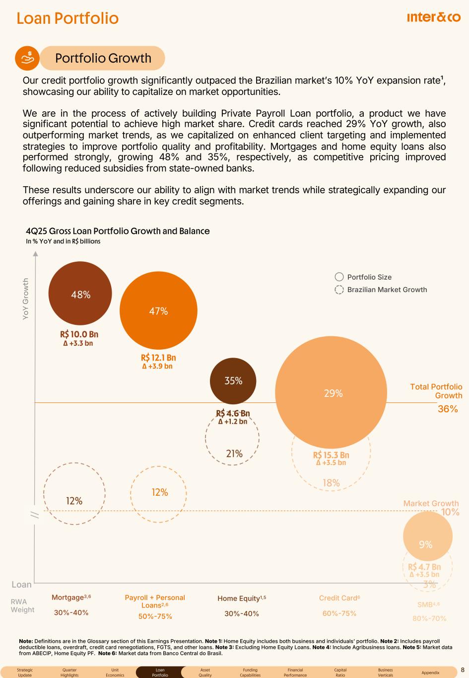 Loan Portfolio Loan Portfolio Payroll  Personal3 SMBs2 Credit Card Total R$ millions Note Definitions are in the Appendix section of this Earnings Release. Note 1 Total gross loan portfolio divided by total active clients. Note 2 SMB includes Agribusiness loans. Note 3 Personal includes payroll deductible loans, overdraft, credit card renegotiations, FGTS, Private Payroll, and other loans. Note 4 Home Equity includes both business and individuals’ portfolio. Note 5 Mortgage Loans in US market. Note 6 Excluding Home Equity and US Mortgage Loans. 4Q25 3Q25 4Q24 ∆QoQ ∆YoY Gross Loan Portfolio Real Estate 16,195 14,524 11,250 +11.5% +44.0% Home Equity 4,647 4,156 3,444 +11.8% +34.9% US Mortgage 1,568 1,463 1,080 +7.2% +45.2% Mortgage 9,980 8,905 6,726 +12.1% +48.4% Personal 12,114 11,071 8,237 +9.4% +47.1% SMBs 4,294 3,917 3,969 +9.6% +8.2% Credit Cards 15,262 13,967 11,800 +9.3% +29.3% Agribusiness 387 339 341 +14.1% +13.5% Total 48,251 43,818 35,596 +10.1% +35.6% Variation % Loans per Active Client1 Quarter Highlights Appendix Unit Economics Loan Portfolio Asset Quality Funding Capabilities Financial Performance Capital Ratio Business Verticals Strategic Update 7 In 2025, our loan portfolio grew by an impressive 36% YoY, driven by consistent market share gains across key segments. Highlights include Private Payroll Loans, which reached R$1.9 billion with a highly scalable, low- cost, and collateralized model, along with mortgages, which expanded 48% YoY to R$10 billion, consolidating our position in real estate financing. Credit card loans also grew by 29%, supported by enhanced underwriting modeling, new segmentation and a focus on improving profitability. The diverse growth across our product mix reflects the success of our strategy on delivering tailored, scalable credit solutions, seizing growing opportunities while controlling risks. 6.3; 21.2% 6.3; 20.4% 6.4; 19.4% 6.5; 19.3% 6.7; 18.9% 7.3; 19.5% 8.1; 20.2% 8.9; 20.3% 10.0; 20.7% 0.5; 1.6% 0.7; … 1.1; 3.0% 1.3; 3.5% 1.4; 3.4% 1.5; 3.3% 1.6; 3.2% 2.3; 7.6% 2.5; 8.1% 2.8; 8.4% 3.1; 9.3% 3.4; 9.7% 3.6; 9.6% 3.8; 9.5% 4.2; 9.5% 4.6; 9.6% 7.1; 24.0% 7.4; 24.1% 7.6; 22.9% 8.0; 23.7% 8.2; 23.1% 8.9; 23.8% 10.0; 24.7% 11.1; 25.3% 12.1; 25.1% 9.5; 31.8% 10.1; 32.8% 10.5; 31.9% 10.8; 32.0% 11.8; 33.1% 12.3; 32.8% 13.0; 32.3% 14.0; 31.9% 15.3; 31.6% 4.6; 15.4% 4.2; 13.6% 5.2; 15.8% 4.7; 13.8% 4.3; 12.1% 4.0; 10.8% 4.0; 9.9% 4.3; 9.7% 4.7; 9.7% 29.8 30.9 33.0 33.7 35.6 37.4 40.2 43.8 48.3 - 5 .0 1 0. 0 1 5. 0 2 0 .0 2 5. 0 3 0 .0 3 5. 0 4 0 .0 4 5. 0 5 0 .0 4Q23 1Q24 2Q24 3Q24 4Q24 1Q25 2Q25 3Q25 4Q25 Mortgage6 Home Equity4 US Mortgage5 1.82 1.77 1.79 1.73 1.73 1.73 1.77 1.83 1.93 1 .7 1 .7 1 .8 1 .8 1 .9 1 .9 2 .0 Loan Portfolio & Loan per active client In R$ billion & in R$ thousands