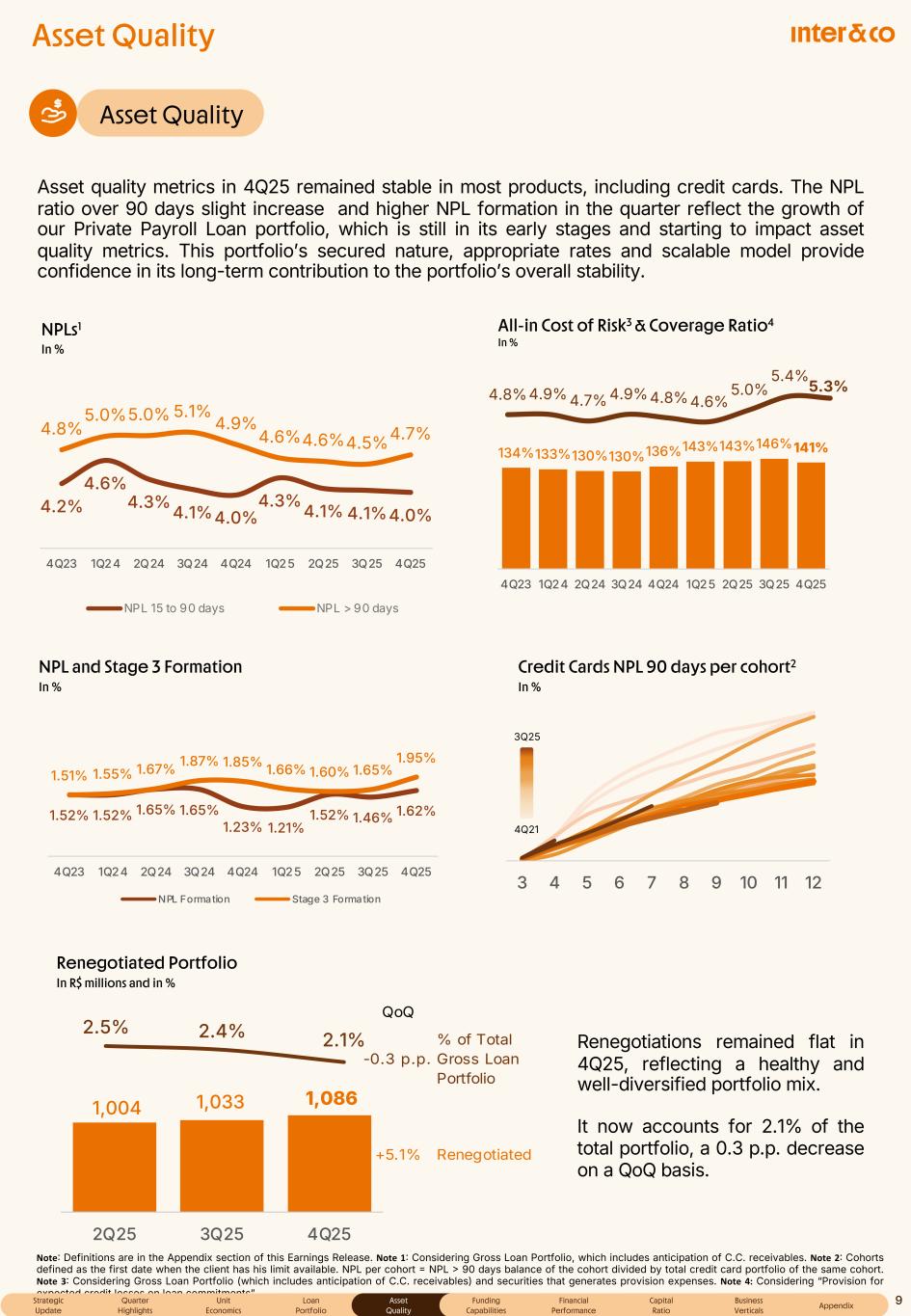 Asset Quality Asset Quality 1.52% 1.52% 1.65% 1.65% 1.23% 1.21% 1.52% 1.46% 1.62% 1.51% 1.55% 1.67% 1.87% 1.85% 1.66% 1.60% 1.65% 1.95% 0 .0 0% 1. 0 % 2 .0 0% 3 .0 0% 4 .0 0% 5 .0 0% 6 .0 0% 7 .0 0% 4Q23 1Q24 2Q24 3Q24 4Q24 1Q25 2Q25 3Q25 4Q25 NPL Formation Stage 3 Formation NPLs1 In % Note Definitions are in the Appendix section of this Earnings Release. Note 1 Considering Gross Loan Portfolio, which includes anticipation of C.C. receivables. Note 2 Cohorts defined as the first date when the client has his limit available. NPL per cohort  NPL  90 days balance of the cohort divided by total credit card portfolio of the same cohort. Note 3 Considering Gross Loan Portfolio (which includes anticipation of C.C. receivables) and securities that generates provision expenses. Note 4: Considering “Provision for expected credit losses on loan commitments” Credit Cards NPL 90 days per cohort2 In % NPL and Stage 3 Formation In % Quarter Highlights Appendix Unit Economics Loan Portfolio Asset Quality Funding Capabilities Financial Performance Capital Ratio Business Verticals Strategic Update 9 Asset quality metrics in 4Q25 remained stable in most products, including credit cards. The NPL ratio over 90 days slight increase and higher NPL formation in the quarter reflect the growth of our Private Payroll Loan portfolio, which is still in its early stages and starting to impact asset quality metrics. This portfolio’s secured nature, appropriate rates and scalable model provide confidence in its long-term contribution to the portfolio’s overall stability. 3 4 5 6 7 8 9 10 11 12 134%133%130%130%136%143%143%146%141% 0 .0 % 2 0. 0% 4 0. 0% 6 0. 0% 8 0. 0% 10 0 .0 % 12 0 .0 % 14 0 .0 % 16 0 .0 % 18 0 .0 % 2 0 .0 % 4Q23 1Q24 2Q24 3Q24 4Q24 1Q25 2Q25 3Q25 4Q25 4.8%4.9% 4.7% 4.9%4.8%4.6% 5.0% 5.4%5.3% 2 .0 % 2 .5 % 3 .0 % 3 .5 % 4 .0 % 4 .5 % 5 .0 % 5 .5 % 6 .0 % 6 .5 % 7 .0 % All-in Cost of Risk3 & Coverage Ratio4 In % 4.2% 4.6% 4.3%4.1%4.0% 4.3%4.1% 4.1%4.0% 4.8% 5.0%5.0% 5.1% 4.9% 4.6%4.6%4.5%4.7% 3 .0 % 3 .5 % 4 .0 % 4 .5 % 5 .0 % 5 .5 % 6 .0 % 4Q23 1Q24 2Q24 3Q24 4Q24 1Q25 2Q25 3Q25 4Q25 NPL 15 to 90 days NPL > 90 days Renegotiations remained flat in 4Q25, reflecting a healthy and well-diversified portfolio mix. It now accounts for 2.1% of the total portfolio, a 0.3 p.p. decrease on a QoQ basis. Renegotiated Portfolio In R$ millions and in % QoQ -0.3 p.p. % of Total Gross Loan Portfolio +5.1% Renegotiated 2.5% 2.4% 2.1% 1,004 1,033 1,086 - 2 0 4 0 6 0 8 0 1 ,0 0 1 ,20 0 1 ,40 0 2Q25 3Q25 4Q25 3Q25 4Q21
