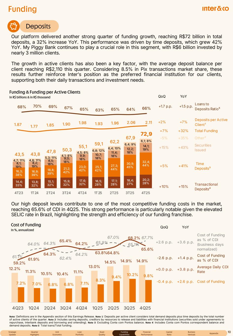Funding Note Definitions are in the Appendix section of this Earnings Release. Note 1 Deposits per active client considers total demand deposits plus time deposits by the total number of active clients of the quarter. Note 2 Includes saving deposits, creditors by resources to release and liabilities with financial institutions (securities sold under agreements to repurchase, interbank deposits and borrowing and onlending). Note 3 Excluding Conta com Pontos balance. Note 4 Includes Conta com Pontos correspondent balance and demand deposits. Note 5 Total loans/Total funding. Cost of Funding In %, annualized Quarter Highlights Appendix Unit Economics Loan Portfolio Asset Quality Funding Capabilities Financial Performance Capital Ratio Business Verticals Strategic Update 10 Our high deposit levels contribute to one of the most competitive funding costs in the market, reaching 65.6% of CDI in 4Q25. This strong performance is particularly notable given the elevated SELIC rate in Brazil, highlighting the strength and efficiency of our funding franchise. 12.2% 11.3% 10.5% 10.4% 11.1% 13.0% 14.5% 14.9% 14.9% 7.2% 7.0% 6.8% 6.8% 7.1% 8.3% 9.4% 10.2% 9.8% 59.2% 61.9% 64.3% 65.4% 64.2% 63.8%64.8% 68.2% 65.6% 61.1% 64.0% 64.3% 62.4% 64.2% 65.9% 67.0% 65.1% 67.7% 2.0% 7.0% 12.0% 17.0% 22.0 % 4Q23 1Q24 2Q24 3Q24 4Q24 1Q25 2Q25 3Q25 4Q25 QoQ YoY +2.6 p.p. +3.6 p.p. Cost of Funding as % of CDI (business days normalized) -2.6 p.p. +1.4 p.p. Cost of Funding as % of CDI +0.0 p.p. +3.8 p.p. Average Daily CDI Rate -0.4 p.p. +2.6 p.p. Cost of Funding 14,4; 33% 13,8; 32% 15,1; 32% 15,9; 32% 17,6; 32% 16,5; 28% 17,1; 28% 18,4; 27% 20,2; 28% 16,3; 38% 16,9; 39% 18,8; 39% 21,2; 42% 23,0; 42% 25,1; 42% 27,3; 44% 30,9; 45% 32,4; 44% 8,1; 19% 8,2; 19% 8,5; 18% 9,0; 18% 9,9; 18% 10,7; 18% 11,4; 18% 12,2; 18% 14,1; 19% 4,7; 11% 4,8; 11% 5,3; 11% 4,1; 8% 4,5; 8% 6,8; 12% 6,4; 10% 6,4; 9% 6,1; 8% 43,5 43,8 47,8 50,3 55,1 59,1 62,2 67,9 72,9 4T23 1T24 2T24 3T24 4T24 1T25 2T25 3T25 4T25 Deposits Funding & Funding per Active Clients In R$ billions & in R$ thousand Our platform delivered another strong quarter of funding growth, reaching R$72 billion in total deposits, a 32% increase YoY. This performance was driven by time deposits, which grew 42% YoY. My Piggy Bank continues to play a crucial role in this segment, with R$6 billion invested by nearly 3 million clients. The growth in active clients has also been a key factor, with the average deposit balance per client reaching R$2,110 this quarter. Considering 8.5% in Pix transactions market share, these results further reinforce Inter’s position as the preferred financial institution for our clients, supporting both their daily transactions and investment needs. 1.87 1.77 1.85 1.90 1.98 1.93 1.96 2.06 2.11 1 .70 1 .80 1 .90 2 .0 2 .10 2 .20 68% 70% 69% 67% 65% 63% 65% 64% 66% 6 0% 6 5% 7 0% 7 5% 8 0% QoQ YoY +1.7 p.p. +1.5 p.p. Loans to Deposits Ratio⁵ +2% +7% Deposits per Active Client¹ +7% +32% Total Funding -5% +35% Other² +15% +43% Securities Issued +5% +41% Time Deposits³ +10% +15% Transactional Deposits⁴