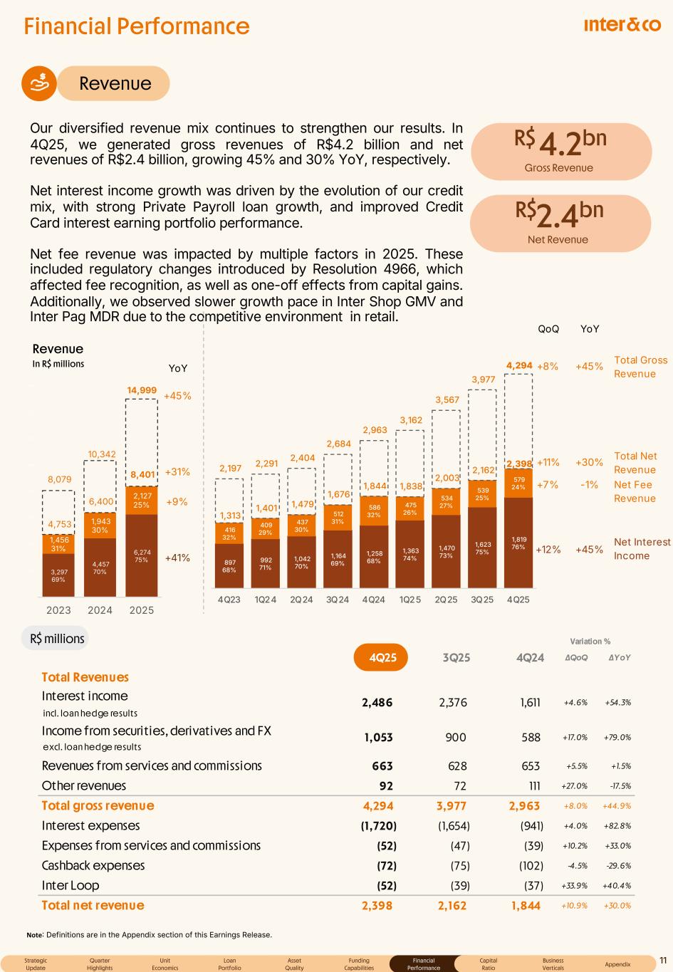 Financial Performance Revenue R$ millions Note Definitions are in the Appendix section of this Earnings Release. 4Q25 3Q25 4Q24 ∆QoQ ∆YoY Total Revenues Interest income incl. loan hedge results Income from securities, derivatives and FX excl. loan hedge results Revenues from services and commissions 663 628 653 +5.5% +1.5% Other revenues 92 72 111 +27.0% -17.5% Total gross revenue 4,294 3,977 2,963 +8.0% +44.9% Interest expenses (1,720) (1,654) (941) +4.0% +82.8% Expenses from services and commissions (52) (47) (39) +10.2% +33.0% Cashback expenses (72) (75) (102) -4.5% -29.6% Inter Loop (52) (39) (37) +33.9% +40.4% Total net revenue 2,398 2,162 1,844 +10.9% +30.0% Variation % 2,486 2,376 1,611 +4.6% +54.3% 1,053 900 588 +17.0% +79.0% QoQ YoY +8% +45% Total Gross Revenue +11% +30% Total Net Revenue +7% -1% Net Fee Revenue +12% +45% Net Interest Income 897 68% 992 71% 1,042 70% 1,164 69% 1,258 68% 1,363 74% 1,470 73% 1,623 75% 1,819 76% 416 32% 409 29% 437 30% 512 31% 586 32% 475 26% 534 27% 539 25% 579 24% 1,313 1,401 1,479 1,676 1,844 1,838 2,003 2,162 2,398 2,197 2,291 2,404 2,684 2,963 3,162 3,567 3,977 4,294 4Q23 1Q24 2Q24 3Q24 4Q24 1Q25 2Q25 3Q25 4Q25 Quarter Highlights Appendix Unit Economics Loan Portfolio Asset Quality Funding Capabilities Financial Performance Capital Ratio Business Verticals Strategic Update R$ 4.2bn Gross Revenue R$2.4bn Net Revenue 11 Our diversified revenue mix continues to strengthen our results. In 4Q25, we generated gross revenues of R$4.2 billion and net revenues of R$2.4 billion, growing 45% and 30% YoY, respectively. Net interest income growth was driven by the evolution of our credit mix, with strong Private Payroll loan growth, and improved Credit Card interest earning portfolio performance. Net fee revenue was impacted by multiple factors in 2025. These included regulatory changes introduced by Resolution 4966, which affected fee recognition, as well as one-off effects from capital gains. Additionally, we observed slower growth pace in Inter Shop GMV and Inter Pag MDR due to the competitive environment in retail. Revenue In R$ millions 3,297 69% 4,457 70% 6,274 75% 1,456 31% 1,943 30% 2,127 25% 4,753 6,400 8,401 8,079 10,342 14,999 - 2 ,0 00 4 ,0 00 6 ,0 00 8 ,0 00 10 ,0 00 12 ,0 00 14 ,0 00 16 ,0 00 2023 2024 2025 YoY +45% +31% +9% +41%