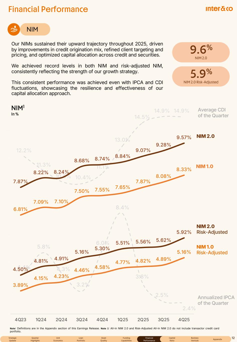 12.2% 11.3% 10.5% 10.4% 11.1% 13.0% 14.5% 14.9% 14.9% 4.4% 5.8% 4.3% 3.2% 6.0% 8.4% 3.8% 2.5% 2.4% 1.0 % 3. 0% 5. 0% 7. 0% 9. 0% 11.0 % 13. 0% 15. 0% 6.81% 7.09% 7.10% 7.50% 7.55% 7.65% 7.87% 8.08% 8.33% 7.87% 8.22% 8.24% 8.68% 8.74% 8.84% 9.07% 9.28% 9.57% 3.89% 4.15% 4.23% 4.46% 4.58% 4.77% 4.82% 4.89% 5.16% 4.50% 4.81% 4.91% 5.16% 5.30% 5.51% 5.56% 5.62% 5.92% 3. 0% 4. 0% 5. 0% 6. 0% 7. 0% 8. 0% 9. 0% 10. 0% 11.0 % 4Q23 1Q24 2Q24 3Q24 4Q24 1Q25 2Q25 3Q25 4Q25 Financial Performance NIM Quarter Highlights Appendix Unit Economics Loan Portfolio Asset Quality Funding Capabilities Financial Performance Capital Ratio Business Verticals Strategic Update 9.6% NIM 2.0 5.9% NIM 2.0 Risk-Adjusted Note Definitions are in the Appendix section of this Earnings Release. Note 1 All-in NIM 2.0 and Risk-Adjusted All-in NIM 2.0 do not include transactor credit card portfolio. 12 Our NIMs sustained their upward trajectory throughout 2025, driven by improvements in credit origination mix, refined client targeting and pricing, and optimized capital allocation across credit and securities. We achieved record levels in both NIM and risk-adjusted NIM, consistently reflecting the strength of our growth strategy. This consistent performance was achieved even with IPCA and CDI fluctuations, showcasing the resilience and effectiveness of our capital allocation approach. NIM 2.0 NIM 1.0 NIM 2.0 Risk-Adjusted NIM 1.0 Risk-Adjusted Average CDI of the Quarter Annualized IPCA of the Quarter NIM1 In %