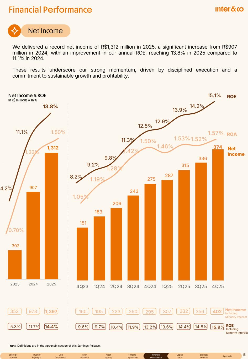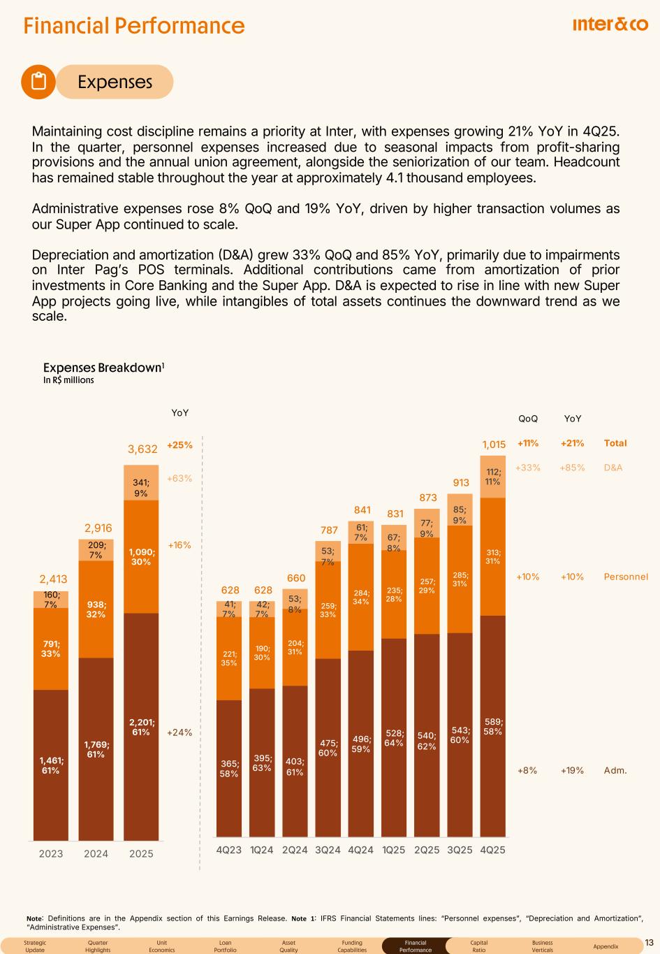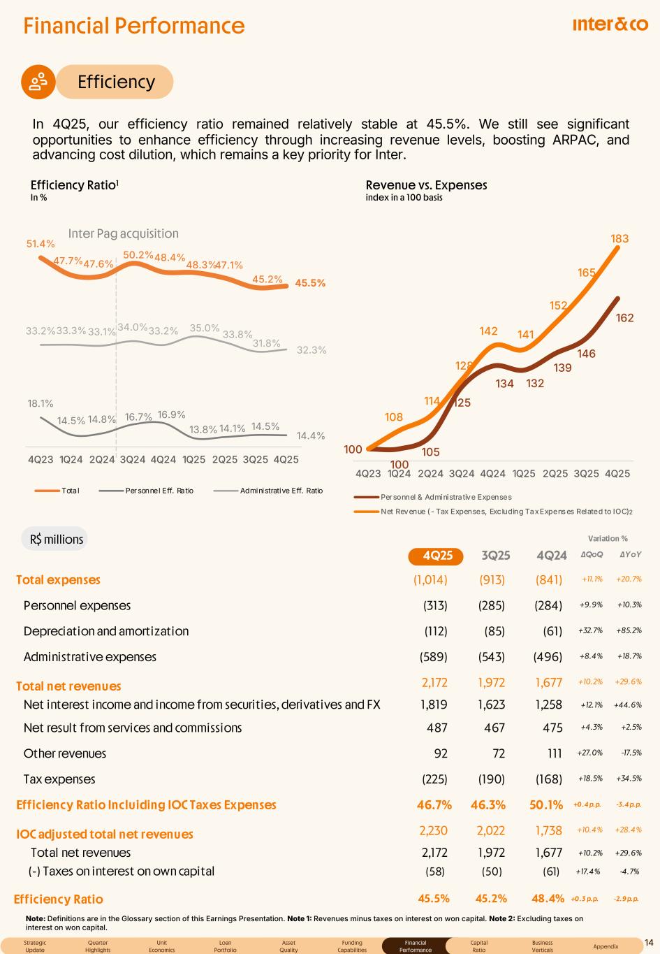 Financial Performance Expenses Note Definitions are in the Appendix section of this Earnings Release. Note 1 IFRS Financial Statements lines: “Personnel expenses”, “Depreciation and Amortization”, “Administrative Expenses”. Quarter Highlights Appendix Unit Economics Loan Portfolio Asset Quality Funding Capabilities Financial Performance Capital Ratio Business Verticals Strategic Update 13 Maintaining cost discipline remains a priority at Inter, with expenses growing 21% YoY in 4Q25. In the quarter, personnel expenses increased due to seasonal impacts from profit-sharing provisions and the annual union agreement, alongside the seniorization of our team. Headcount has remained stable throughout the year at approximately 4.1 thousand employees. Administrative expenses rose 8% QoQ and 19% YoY, driven by higher transaction volumes as our Super App continued to scale. Depreciation and amortization D&A grew 33% QoQ and 85% YoY, primarily due to impairments on Inter Pag’s POS terminals. Additional contributions came from amortization of prior investments in Core Banking and the Super App. D&A is expected to rise in line with new Super App projects going live, while intangibles of total assets continues the downward trend as we scale. QoQ YoY +11% +21% Total +33% +85% D&A +10% +10% Personnel +8% +19% Adm. Expenses Breakdown1 In R$ millions 365; 58% 395; 63% 403; 61% 475; 60% 496; 59% 528; 64% 540; 62% 543; 60% 589; 58% 221; 35% 190; 30% 204; 31% 259; 33% 284; 34% 235; 28% 257; 29% 285; 31% 313; 31% 41; 7% 42; 7% 53; 8% 53; 7% 61; 7% 67; 8% 77; 9% 85; 9% 112; 11% 628 628 660 787 841 831 873 913 1,015 - 2 0 0 4 0 0 6 0 0 8 0 0 1 ,0 0 1 ,2 0 4Q23 1Q24 2Q24 3Q24 4Q24 1Q25 2Q25 3Q25 4Q25 1,461; 61% 1,769; 61% 2,201; 61% 791; 33% 938; 32% 1,090; 30% 160; 7% 209; 7% 341; 9% 2,413 2,916 3,632 2023 2024 2025 YoY +25% +63% +16% +24%