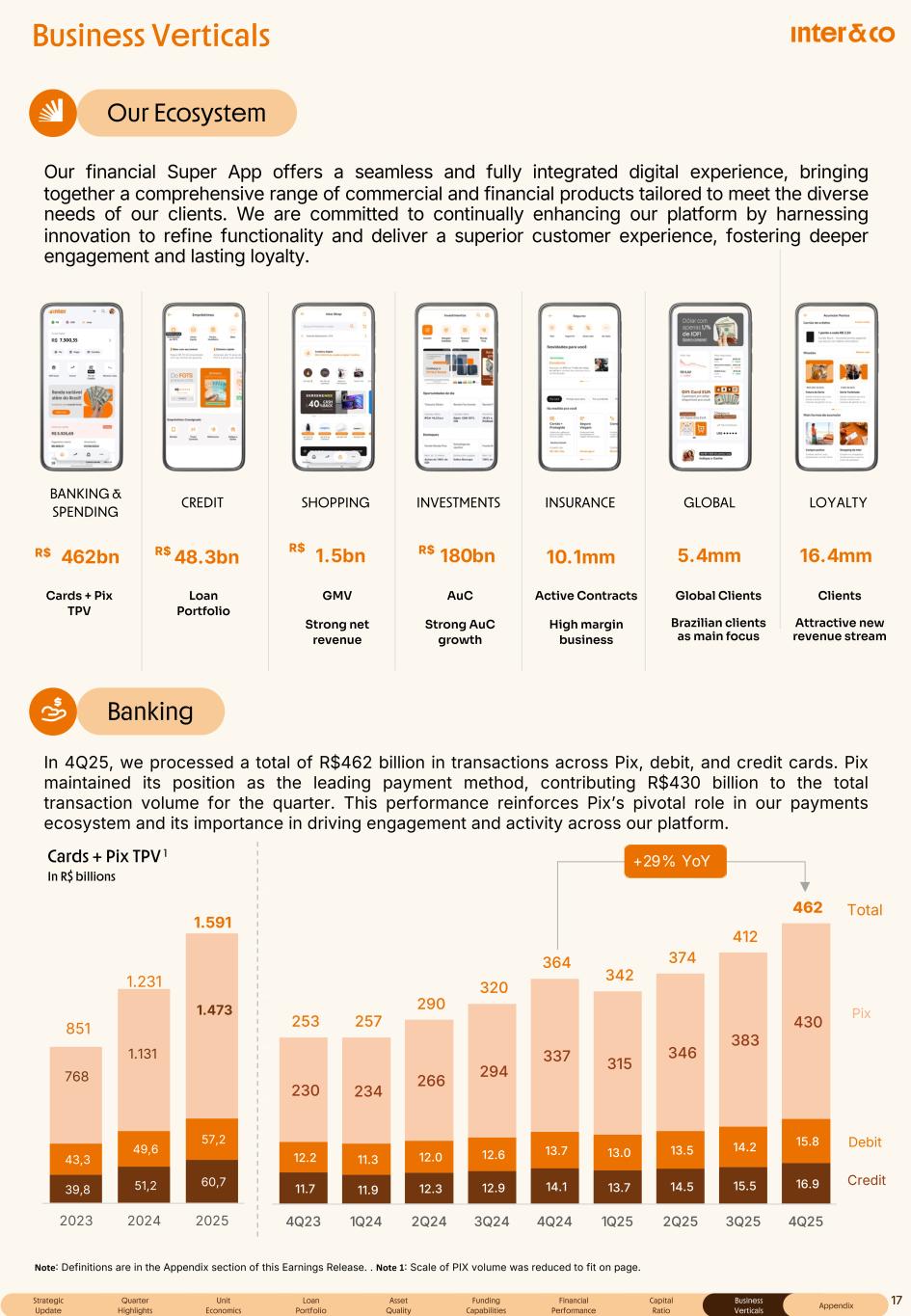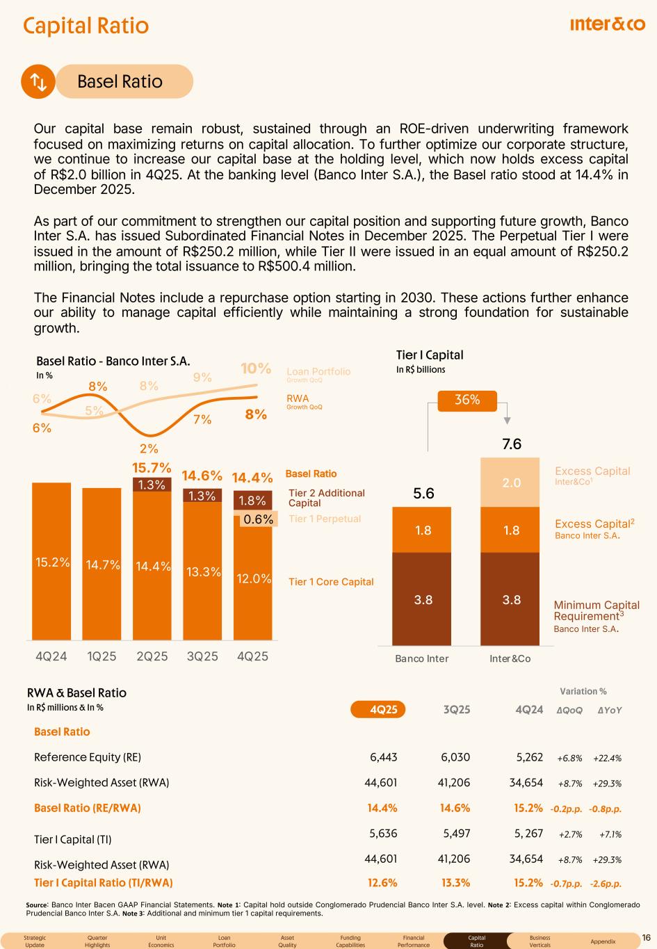 15.2% 14.7% 14.4% 13.3% 12.0% 0.6% 1.3% 1.3% 1.8% 15.7% 14.6% 14.4% 0 .0 % 2 .0 % 4 .0 % 6 .0 % 8 .0 % 10 .0 % 12 .0 % 14 .0 % 16 .0 % 18 .0 % 4Q24 1Q25 2Q25 3Q25 4Q25 Capital Ratio Basel Ratio Our capital base remain robust, sustained through an ROE-driven underwriting framework focused on maximizing returns on capital allocation. To further optimize our corporate structure, we continue to increase our capital base at the holding level, which now holds excess capital of R$2.0 billion in 4Q25. At the banking level Banco Inter S.A.), the Basel ratio stood at 14.4% in December 2025. As part of our commitment to strengthen our capital position and supporting future growth, Banco Inter S.A. has issued Subordinated Financial Notes in December 2025. The Perpetual Tier I were issued in the amount of R$250.2 million, while Tier II were issued in an equal amount of R$250.2 million, bringing the total issuance to R$500.4 million. The Financial Notes include a repurchase option starting in 2030. These actions further enhance our ability to manage capital efficiently while maintaining a strong foundation for sustainable growth. Loan Portfolio Growth QoQ RWA Growth QoQ RWA & Basel Ratio In R$ millions & In % Minimum Capital Requirement3 Banco Inter S.A. Excess Capital2 Banco Inter S.A. Source Banco Inter Bacen GAAP Financial Statements. Note 1 Capital hold outside Conglomerado Prudencial Banco Inter S.A. level. Note 2 Excess capital within Conglomerado Prudencial Banco Inter S.A. Note 3 Additional and minimum tier 1 capital requirements. 6% 8% 2% 7% 8% 6% 5% 8% 9% 10% 0% 2% 4% 6% 8% 10% 12% 3.8 3.8 1.8 1.8 2.0 5.6 7.6 - 1 .0 2 .0 3 .0 4 .0 5 .0 6 .0 7 .0 8 .0 9 .0 Banco Inter Inter&Co Excess Capital Inter&Co1 Quarter Highlights Appendix Unit Economics Loan Portfolio Asset Quality Funding Capabilities Financial Performance Capital Ratio Business Verticals Strategic Update 16 Tier 1 Core Capital Tier 2 Additional Capital Basel Ratio Tier I Capital In R$ billions 36% Variation % 4Q25 3Q25 4Q24 ∆QoQ ∆YoY Basel Ratio Reference Equity (RE) 6,443 6,030 5,262 +6.8% +22.4% Risk-Weighted Asset (RWA) 44,601 41,206 34,654 +8.7% +29.3% Basel Ratio (RE/RWA) 14.4% 14.6% 15.2% -0.2p.p. -0.8p.p. Tier I Capital (TI) 5,636 5,497 5, 267 +2.7% +7.1% Risk-Weighted Asset (RWA) 44,601 41,206 34,654 +8.7% +29.3% Tier I Capital Ratio (TI/RWA) 12.6% 13.3% 15.2% -0.7p.p. -2.6p.p. Tier 1 Perpetual Basel Ratio - Banco Inter S.A. In %