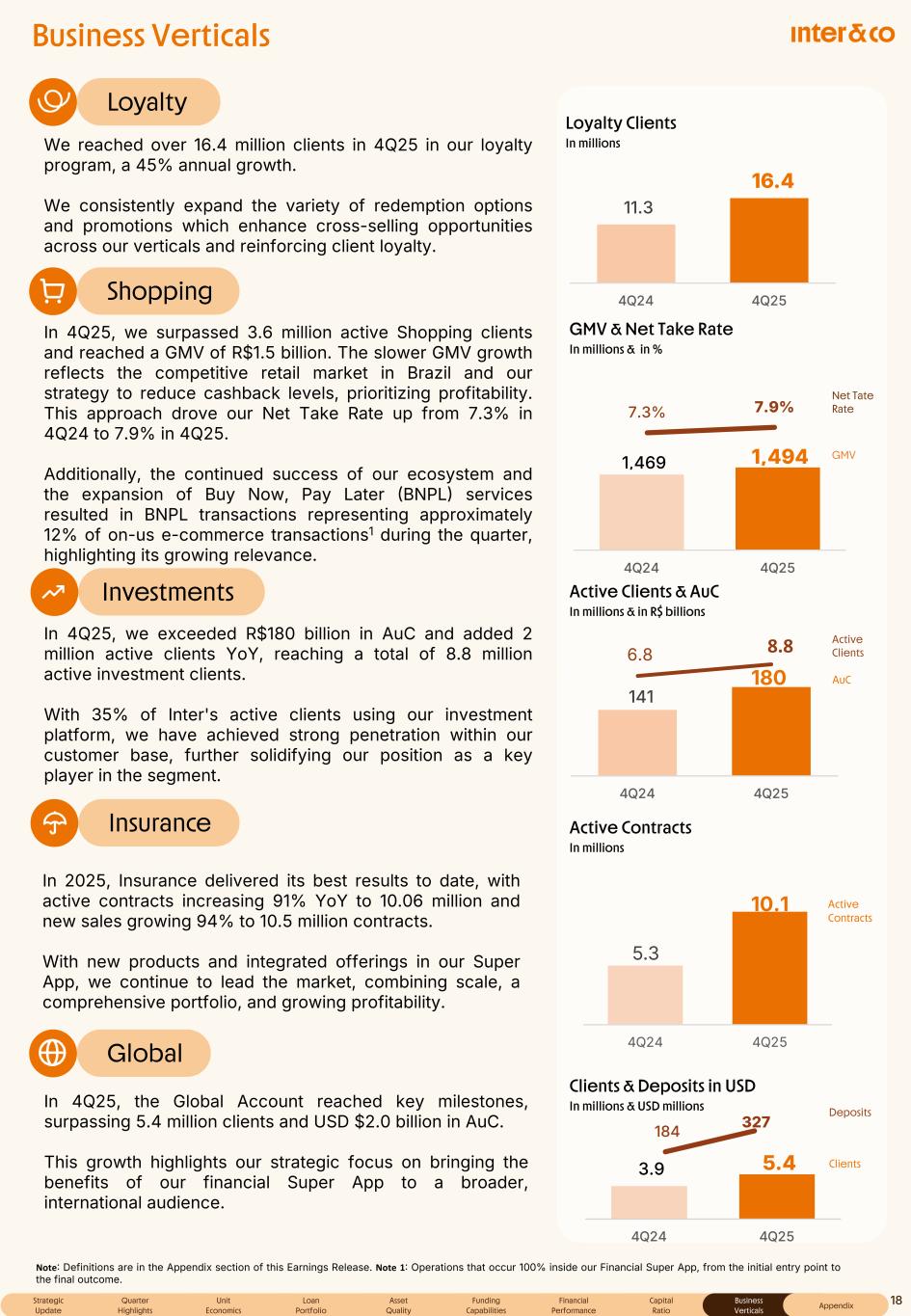 Business Verticals Loyalty Shopping Investments Insurance Global GMV & Net Take Rate In millions & in % Active Clients & AuC In millions & in R$ billions Loyalty Clients In millions Note Definitions are in the Appendix section of this Earnings Release. Note 1 Operations that occur 100% inside our Financial Super App, from the initial entry point to the final outcome. Active Clients AuC 141 180 6.8 8.8 3 0 .0 5 0 .0 7 0. 0 9 0 .0 1 10 .0 1 30 .0 1 50 .0 1 70 .0 1 90 .0 2 10 .0 2 3 0. 4Q24 4Q25 11.3 16.4 0 .0 2 .0 4 .0 6 .0 8 .0 10 .0 12 .0 14 .0 16 .0 18 .0 2 0. 0 4Q24 4Q25 Quarter Highlights Appendix Unit Economics Loan Portfolio Asset Quality Funding Capabilities Financial Performance Capital Ratio Business Verticals Strategic Update Deposits Clients 18 Clients & Deposits in USD In millions & USD millions In 2025, Insurance delivered its best results to date, with active contracts increasing 91% YoY to 10.06 million and new sales growing 94% to 10.5 million contracts. With new products and integrated offerings in our Super App, we continue to lead the market, combining scale, a comprehensive portfolio, and growing profitability. In 4Q25, the Global Account reached key milestones, surpassing 5.4 million clients and USD $2.0 billion in AuC. This growth highlights our strategic focus on bringing the benefits of our financial Super App to a broader, international audience. In 4Q25, we surpassed 3.6 million active Shopping clients and reached a GMV of R$1.5 billion. The slower GMV growth reflects the competitive retail market in Brazil and our strategy to reduce cashback levels, prioritizing profitability. This approach drove our Net Take Rate up from 7.3% in 4Q24 to 7.9% in 4Q25. Additionally, the continued success of our ecosystem and the expansion of Buy Now, Pay Later BNPL services resulted in BNPL transactions representing approximately 12% of on-us e-commerce transactions1 during the quarter, highlighting its growing relevance. In 4Q25, we exceeded R$180 billion in AuC and added 2 million active clients YoY, reaching a total of 8.8 million active investment clients. With 35% of Inter's active clients using our investment platform, we have achieved strong penetration within our customer base, further solidifying our position as a key player in the segment. We reached over 16.4 million clients in 4Q25 in our loyalty program, a 45% annual growth. We consistently expand the variety of redemption options and promotions which enhance cross-selling opportunities across our verticals and reinforcing client loyalty. Active Contracts Net Tate Rate GMV 5.3 10.1 4Q24 4Q25 1,469 1,494 4Q24 4Q25 7.3% 7.9% Active Contracts In millions 184 327 - 5 0. 1 0 .0 1 50 .0 2 0 .0 2 50 .0 3 0 .0 3 50 .0 3.9 5.4 0 .8 1 .3 1 .8 2 .3 2 .8 3 .3 3 .8 4 .3 4 .8 4Q24 4Q25