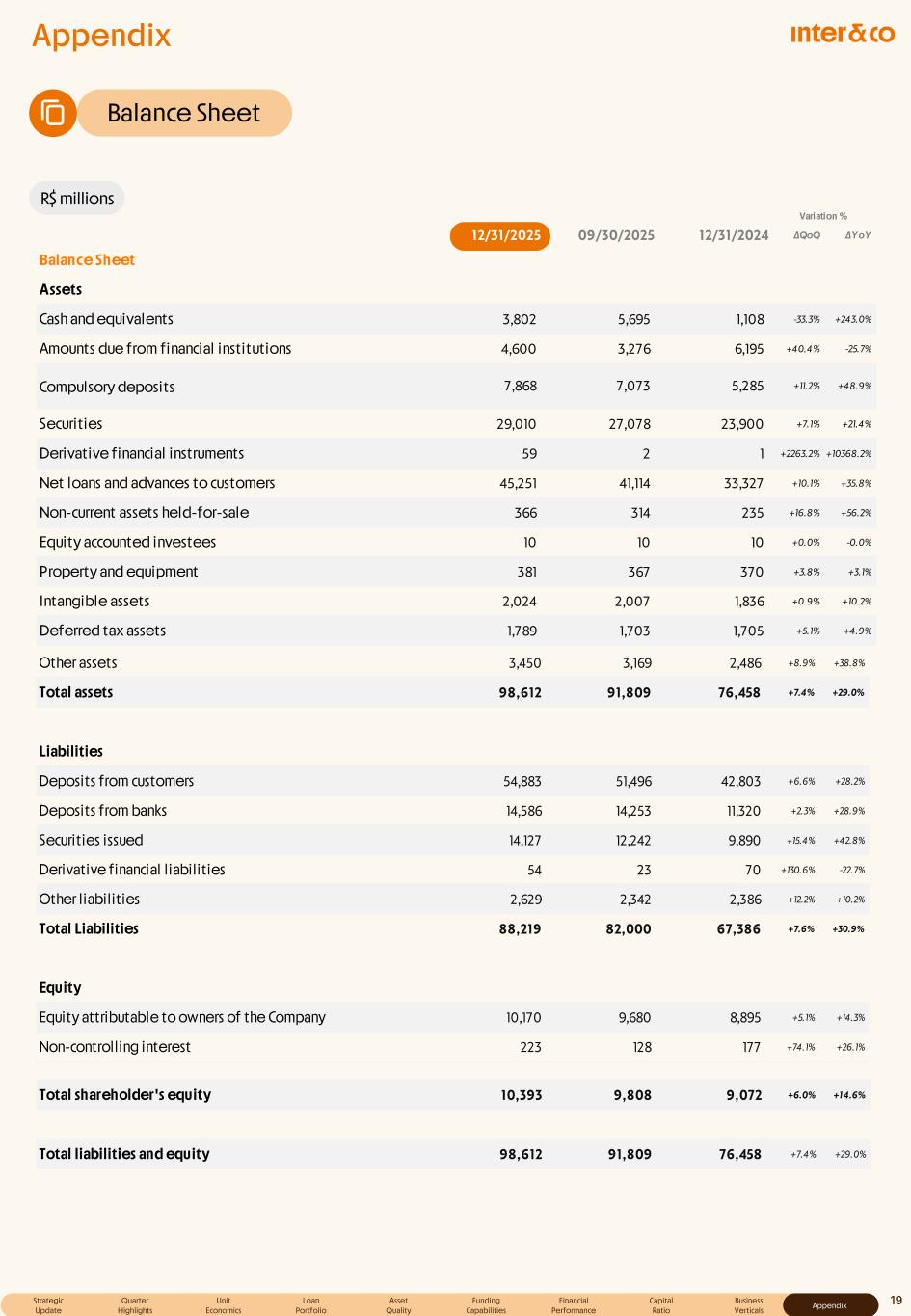 Appendix Balance Sheet R$ millions 12/31/2025 09/30/2025 12/31/2024 ∆QoQ ∆YoY Balance Sheet Assets Cash and equivalents 3,802 5,695 1,108 -33.3% +243.0% Amounts due from financial institutions 4,600 3,276 6,195 +40.4% -25.7% Compulsory deposits 7,868 7,073 5,285 +11.2% +48.9% Securities 29,010 27,078 23,900 +7.1% +21.4% Derivative financial instruments 59 2 1 +2263.2% +10368.2% Net loans and advances to customers 45,251 41,114 33,327 +10.1% +35.8% Non-current assets held-for-sale 366 314 235 +16.8% +56.2% Equity accounted investees 10 10 10 +0.0% -0.0% Property and equipment 381 367 370 +3.8% +3.1% Intangible assets 2,024 2,007 1,836 +0.9% +10.2% Deferred tax assets 1,789 1,703 1,705 +5.1% +4.9% Variation % Other assets 3,450 3,169 2,486 +8.9% +38.8% Total assets 98,612 91,809 76,458 +7.4% +29.0% Liabilities Deposits from customers 54,883 51,496 42,803 +6.6% +28.2% Deposits from banks 14,586 14,253 11,320 +2.3% +28.9% Securities issued 14,127 12,242 9,890 +15.4% +42.8% Derivative financial liabilities 54 23 70 +130.6% -22.7% Other liabilities 2,629 2,342 2,386 +12.2% +10.2% Total Liabilities 88,219 82,000 67,386 +7.6% +30.9% Equity Equity attributable to owners of the Company 10,170 9,680 8,895 +5.1% +14.3% Non-controlling interest 223 128 177 +74.1% +26.1% Total shareholder's equity 10,393 9,808 9,072 +6.0% +14.6% Total liabilities and equity 98,612 91,809 76,458 +7.4% +29.0% 19Quarter Highlights Appendix Unit Economics Loan Portfolio Asset Quality Funding Capabilities Financial Performance Capital Ratio Business Verticals Strategic Update