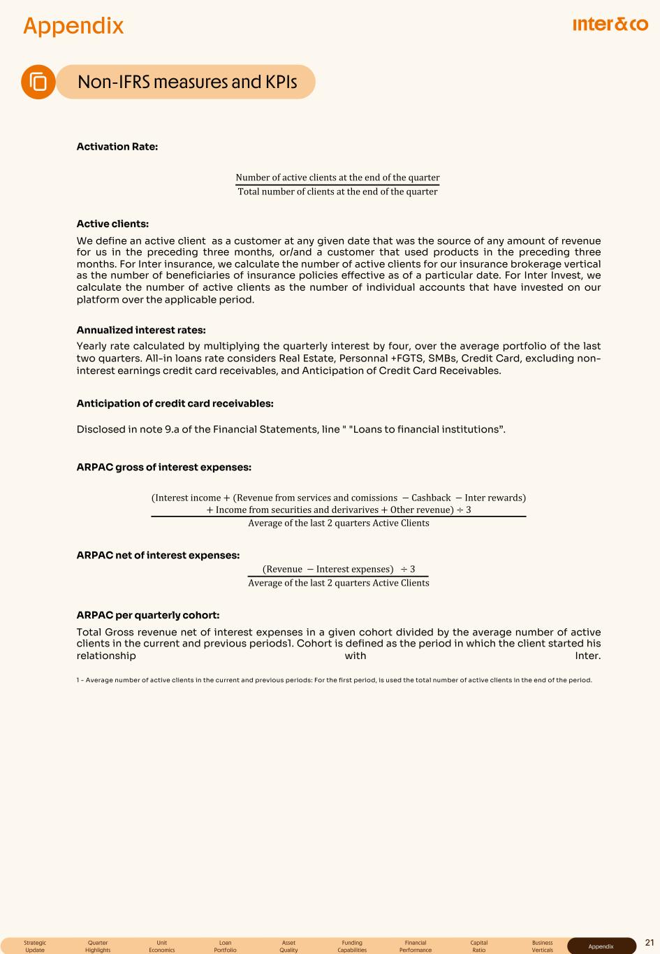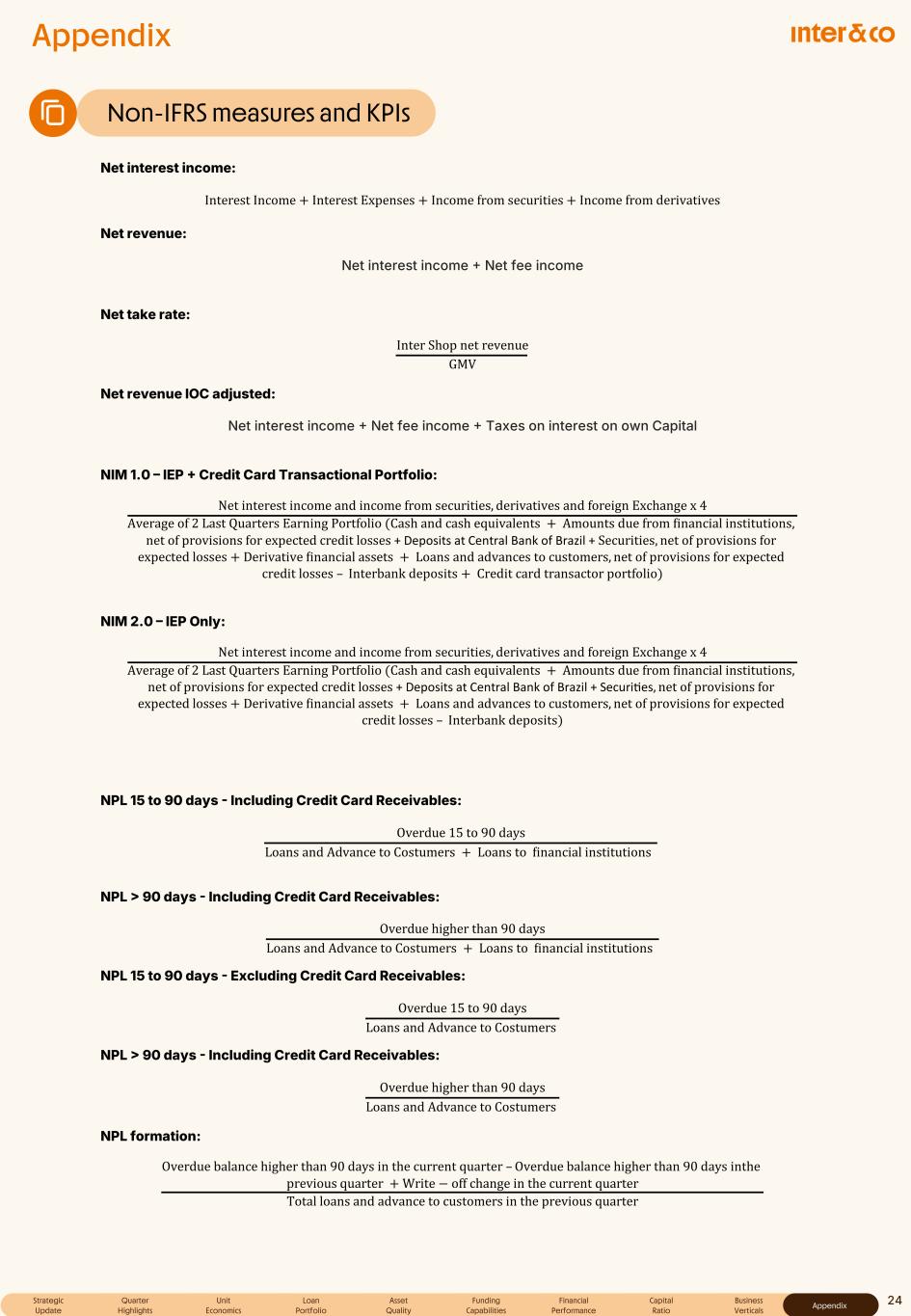 Appendix Non-IFRS measures and KPIs Net interest income: Interest Income + Interest Expenses + Income from securities + Income from derivatives Net revenue: Net interest income  Net fee income Net take rate: Inter Shop net revenue GMV Net revenue IOC adjusted: Net interest income  Net fee income  Taxes on interest on own Capital NIM 1.0  IEP  Credit Card Transactional Portfolio: Net interest income and income from securities, derivatives and foreign Exchange x 4 Average of 2 Last Quarters Earning Portfolio (Cash and cash equivalents + Amounts due from Linancial institutions, net of provisions for expected credit losses + Deposits at Central Bank of Brazil + Securities, net of provisions for expected losses + Derivative Linancial assets + Loans and advances to customers, net of provisions for expected credit losses – Interbank deposits + Credit card transactor portfolio) NIM 2.0  IEP Only: Net interest income and income from securities, derivatives and foreign Exchange x 4 Average of 2 Last Quarters Earning Portfolio (Cash and cash equivalents + Amounts due from Linancial institutions, net of provisions for expected credit losses + Deposits at Central Bank of Brazil + Securi$es, net of provisions for expected losses + Derivative Linancial assets + Loans and advances to customers, net of provisions for expected credit losses – Interbank deposits) NPL 15 to 90 days  Including Credit Card Receivables: Overdue 15 to 90 days Loans and Advance to Costumers + Loans to Linancial institutions NPL  90 days  Including Credit Card Receivables: Overdue higher than 90 days Loans and Advance to Costumers + Loans to Linancial institutions NPL 15 to 90 days  Excluding Credit Card Receivables: Overdue 15 to 90 days Loans and Advance to Costumers NPL  90 days  Including Credit Card Receivables: Overdue higher than 90 days Loans and Advance to Costumers NPL formation: Overdue balance higher than 90 days in the current quarter – Overdue balance higher than 90 days inthe previous quarter + Write − off change in the current quarter Total loans and advance to customers in the previous quarter 24Quarter Highlights Appendix Unit Economics Loan Portfolio Asset Quality Funding Capabilities Financial Performance Capital Ratio Business Verticals Strategic Update