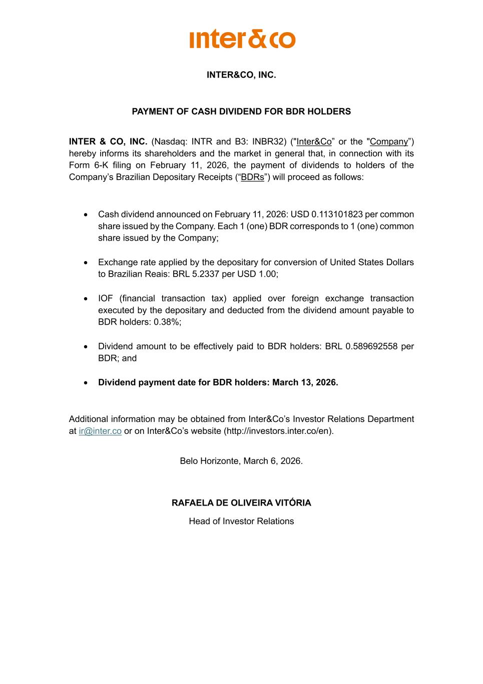 INTER&CO, INC. PAYMENT OF CASH DIVIDEND FOR BDR HOLDERS INTER & CO, INC. (Nasdaq: INTR and B3: INBR32) ("Inter&Co” or the "Company”) hereby informs its shareholders and the market in general that, in connection with its Form 6-K filing on February 11, 2026, the payment of dividends to holders of the Company’s Brazilian Depositary Receipts (“BDRs”) will proceed as follows: • Cash dividend announced on February 11, 2026: USD 0.113101823 per common share issued by the Company. Each 1 (one) BDR corresponds to 1 (one) common share issued by the Company; • Exchange rate applied by the depositary for conversion of United States Dollars to Brazilian Reais: BRL 5.2337 per USD 1.00; • IOF (financial transaction tax) applied over foreign exchange transaction executed by the depositary and deducted from the dividend amount payable to BDR holders: 0.38%; • Dividend amount to be effectively paid to BDR holders: BRL 0.589692558 per BDR; and • Dividend payment date for BDR holders: March 13, 2026. Additional information may be obtained from Inter&Co’s Investor Relations Department at ir@inter.co or on Inter&Co’s website (http://investors.inter.co/en). Belo Horizonte, March 6, 2026. RAFAELA DE OLIVEIRA VITÓRIA Head of Investor Relations