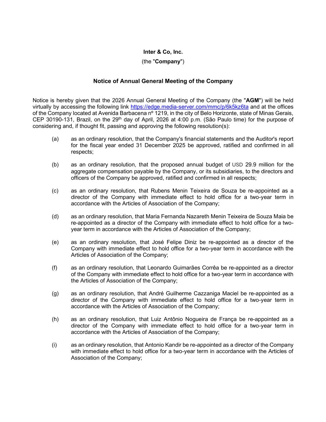 Inter & Co, Inc. (the "Company") Notice of Annual General Meeting of the Company Notice is hereby given that the 2026 Annual General Meeting of the Company (the "AGM") will be held virtually by accessing the following link https://edge.media-server.com/mmc/p/6k5kz6ta and at the offices of the Company located at Avenida Barbacena nº 1219, in the city of Belo Horizonte, state of Minas Gerais, CEP 30190-131, Brazil, on the 29th day of April, 2026 at 4:00 p.m. (São Paulo time) for the purpose of considering and, if thought fit, passing and approving the following resolution(s): (a) as an ordinary resolution, that the Company's financial statements and the Auditor's report for the fiscal year ended 31 December 2025 be approved, ratified and confirmed in all respects; (b) as an ordinary resolution, that the proposed annual budget of USD 29.9 million for the aggregate compensation payable by the Company, or its subsidiaries, to the directors and officers of the Company be approved, ratified and confirmed in all respects; (c) as an ordinary resolution, that Rubens Menin Teixeira de Souza be re-appointed as a director of the Company with immediate effect to hold office for a two-year term in accordance with the Articles of Association of the Company; (d) as an ordinary resolution, that Maria Fernanda Nazareth Menin Teixeira de Souza Maia be re-appointed as a director of the Company with immediate effect to hold office for a two- year term in accordance with the Articles of Association of the Company; (e) as an ordinary resolution, that José Felipe Diniz be re-appointed as a director of the Company with immediate effect to hold office for a two-year term in accordance with the Articles of Association of the Company; (f) as an ordinary resolution, that Leonardo Guimarães Corrêa be re-appointed as a director of the Company with immediate effect to hold office for a two-year term in accordance with the Articles of Association of the Company; (g) as an ordinary resolution, that André Guilherme Cazzaniga Maciel be re-appointed as a director of the Company with immediate effect to hold office for a two-year term in accordance with the Articles of Association of the Company; (h) as an ordinary resolution, that Luiz Antônio Nogueira de França be re-appointed as a director of the Company with immediate effect to hold office for a two-year term in accordance with the Articles of Association of the Company; (i) as an ordinary resolution, that Antonio Kandir be re-appointed as a director of the Company with immediate effect to hold office for a two-year term in accordance with the Articles of Association of the Company;